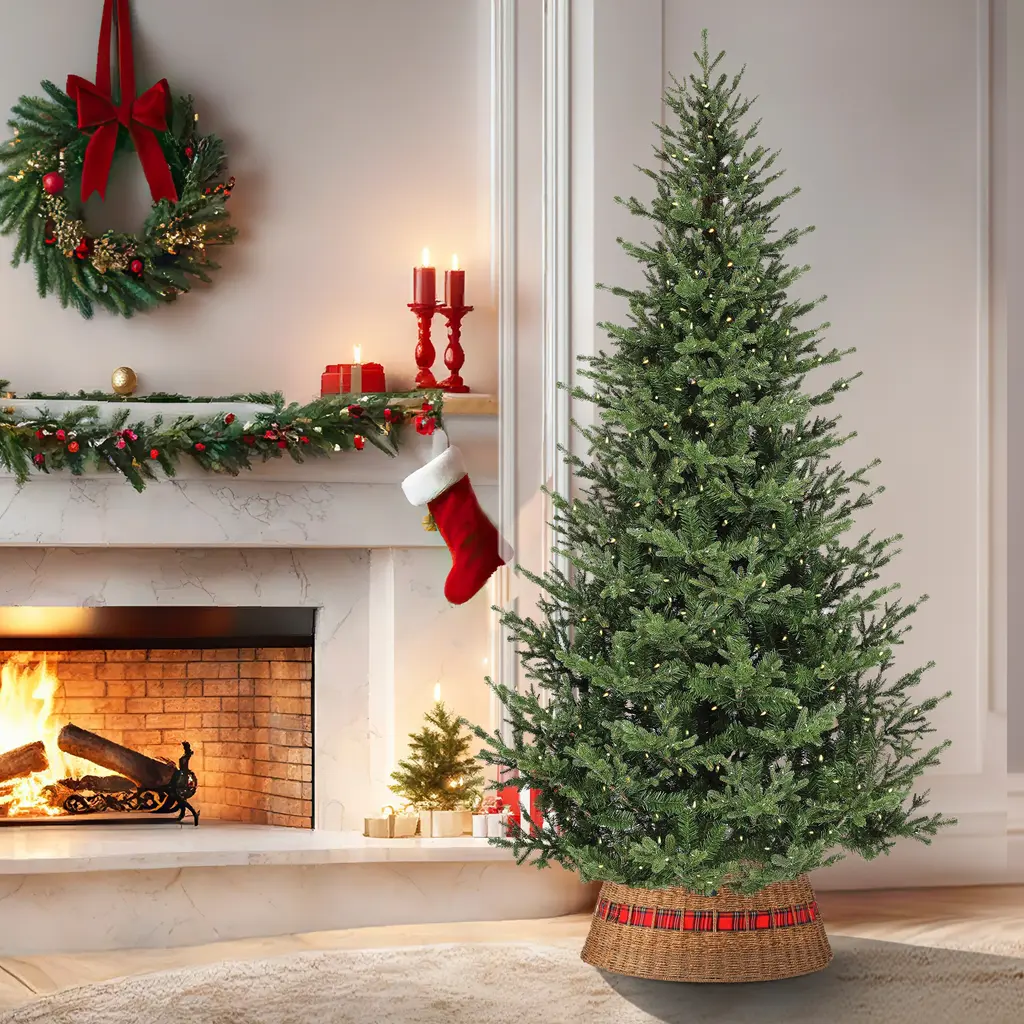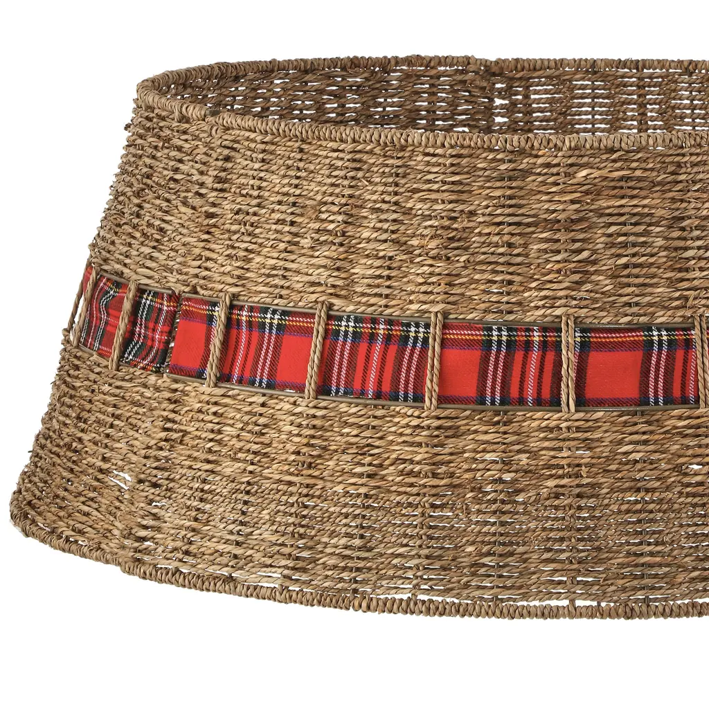 Take a modern twist on the traditional tree skirt with our Christmas tree base cover, in hues of light brown featuring a charming plaid ribbon. Perfect for concealing any tree stand, making a stunning display at the base of your holiday tree. Be sure to place the tree collar around the stand prior to installing your real or artificial tree. Crafted of plastic and metal. Overall measures 11"H x 26" D, , 19" Inner diameter. Blow with canned air for cleaning.