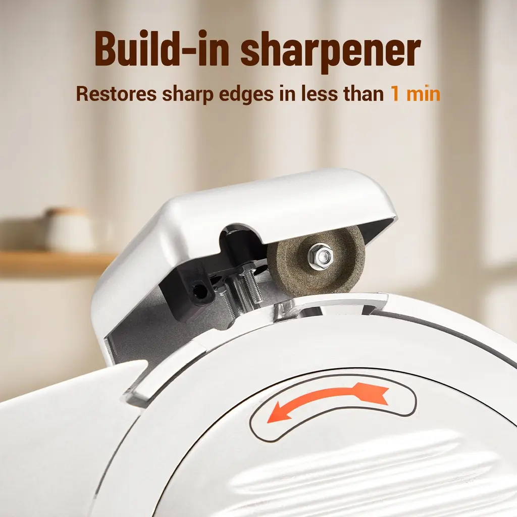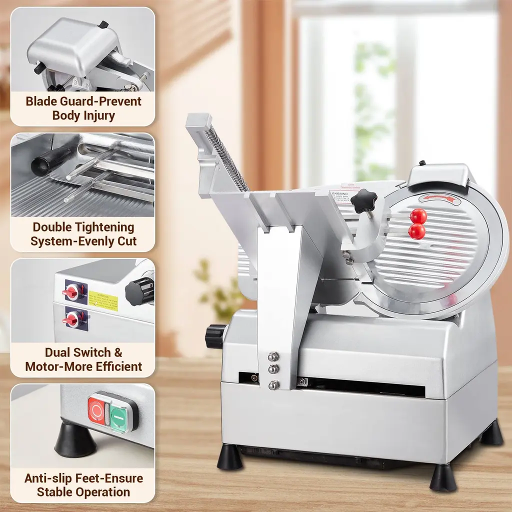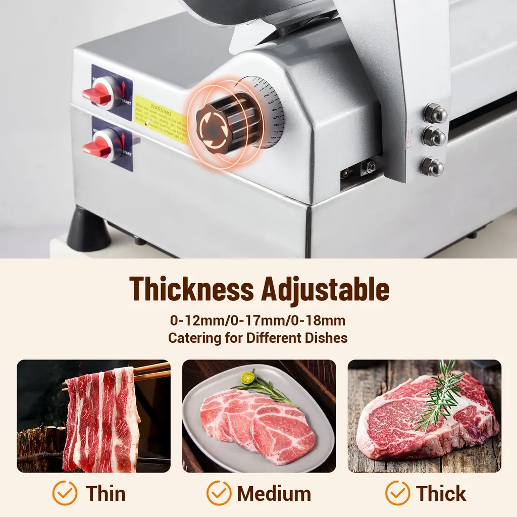 [Cutting 0 to 18mm Thickness] The automatic meat slicer has a cutting range of 0 to 18mm (0-0.7 inches) to meet various cooking needs, such as making thin meat rolls for hot pot or thick meat slices for barbecue . This range allows control of the thickness of each food product, ensuring optimal results. [Durable Alloy Steel Blade] This professional meat slicer uses high-quality 12-inch alloy steel blades for superior durability and cutting efficiency. These blades last twice as long as standard blades and can cut through frozen or cooked meat with ease while maintaining heat-resistant properties for consistent performance. [Built-in Knife Sharpener] The commercial meat slicer comes with an integrated whetstone sharpener, which can quickly restore the blade edge in one minute. This automatic sharpening system increases safety and delivers more even sharpening results compared to manual methods, ensuring reliable performance every time. [Equipped with Powerful 800W Dual Motors] Equipped with powerful 800W dual motors, this meat slicer can easily handle large-scale slicing tasks, with efficiency comparable to a whole day of manual slicing. Easy-to-follow disassembly instructions simplify the cleaning process, making this heavy-duty commercial meat slicer a popular choice for its efficiency, durability, and user-friendly maintenance. [Safety Features] The 12-inch electric food slicer comes with safety features such as an automatic knife sharpener that minimizes direct contact with the blade, a safety knob switch that prevents accidental activation, and a sturdy rubber base that prevents slipping. . In addition, the slicer is designed with a visible oil filling port to facilitate monthly oil replenishment, enhancing the user experience and maintenance process.