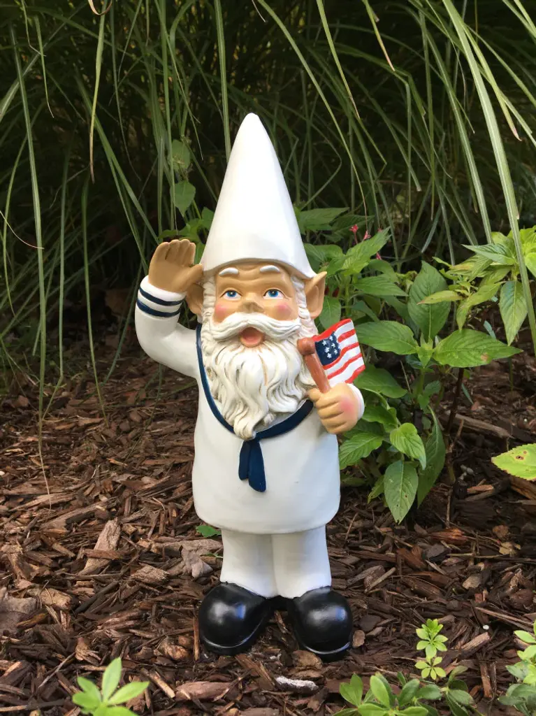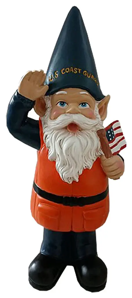 Show your appreciation for our brave and hardworking service men and women with this wonderful Coast Guard Gnome figurine. Standing straight and proud while holding an American flag, this patriotic little gnome knows who protects our country and our values, and honors their work and sacrifice with his salute. Made of long lasting resin and beautifully hand painted, this 12" Coast Guard Gnome is sure to provide many seasons of pleasure.