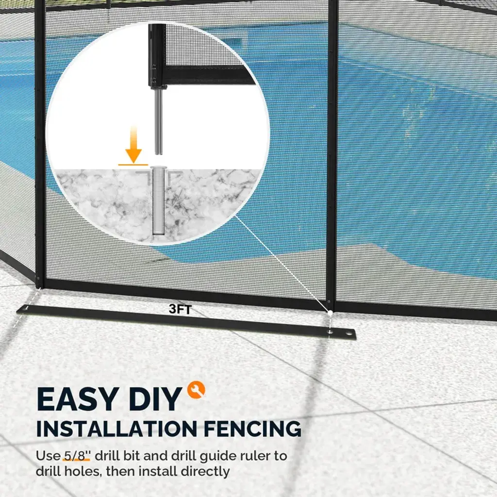 Features: 1. High Quality and Durable: In-ground pool fence made of premium mesh fabric and high quality aluminum which is strong enough to still stand thuderstorms. It is also extremely durable which will not crack easily and can be used for a long time. When not in use, the fence can be rolled up for easy storage and preservation. 2. Easy to Install: This fence section comes complete with hardware and clear instructions, the 5/8'' drill bit is needed to drill holes. It is easy to install as long as you follow the instructions and use the recommended drill. Note: You can also make a fence at the interface to use as the door. 3. Convenient Safety Fence and Dimension: In-ground swimming pool fence child barrier can easily be removed and reinstalled very quickly by a single person, when there are no kids or pets around. Includes two size options, 12 x 4 ft and 12 x 5 ft. They differ only in height. 4. Pool Safety Fencing: This in-ground swimming pool safety fence is designed prevent your pool area from an accidental drowning. Safety Fence which it is a great choice to keep out pets or kids and gives your peace of mind that your child will be safe. 5. Warranty: We ensure that this in-ground swimming pool fence is good quality and is committed to providing the best shopping experience for you. If there is any problem of part missing, pls kindly contact us and send us pic. We are always here for you and will give you best solution.Specifications: 1. Material: Aluminum And Aluminum Alloy, Stainless Steel, Teslin Cloth 2. Color: Black 3. Weight: 12.13 lbs / 14.33 lbs 4. Dimensions: 12 x 4 ft / 12 x 5 ftPackage Includes: 1 x Pool Safety Fence 7 x Plastic Foot Cover 1 x Stainless Steel Ruler