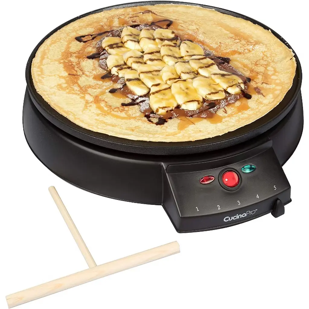 Making crepes has never been so quick and easy. Simply plug the crepe maker in to let it heat up spread a thin layer of batter and watch it cooks in seconds. Our electric Griddle and Crepe maker has a 12-inch diameter surface ideal for traditional French crepes. Features a non-stick aluminum plate and 5 different temperature settings. Batter spreader included.