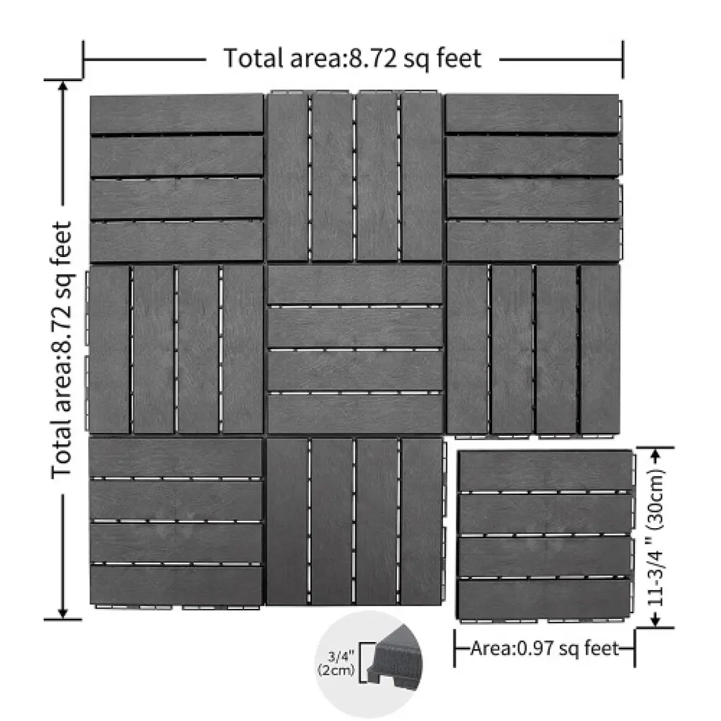 This floor decking makes it easy to upgrade your balcony or deck in an instant, and also section off an area for lounging or for dining. The high quality plastic material makes the deck tiles weather-resistant, lasts longer than natural wood, and have no worry about swelling, decay or mildew. This interlocking plastic deck tile is perfect for refurbishing your old decking. Simply place on top for a clean new look! It's great for garden, patio, porch, pool sides, balcony, lawn, etc., either hard surfaces or semi-hard surfaces.