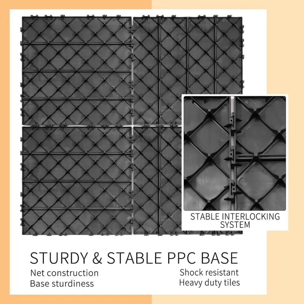 Upgrade your outdoor spaces with these All-Weather Composite Deck Tiles, designed for both beauty and functionality. Crafted from high-hardness plastic, these tiles are waterproof, UV-resistant, and built to withstand the toughest outdoor conditions. Whether you're refreshing your patio, balcony, or deck, the anti-slip surface with a striped textured finish ensures safety in wet conditions, making them perfect for areas around pools or in rain-prone regions. The efficient drainage design with narrow slats and small gaps guarantees a dry and comfortable surface, while the diamond structure on the back promotes airflow and prevents water accumulation. These patio interlocking deck tiles are low-maintenance—just rinse with water to restore their fresh look. Simple to install and customizable, these tiles allow for quick DIY projects and can be easily cut to fit unique layouts or tight spaces, making them the perfect choice for your outdoor flooring needs.Features:Notes: