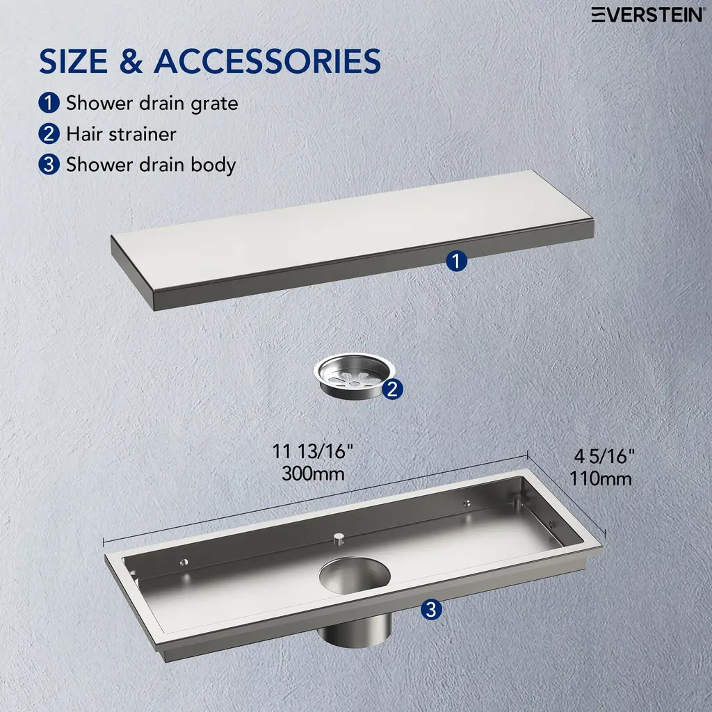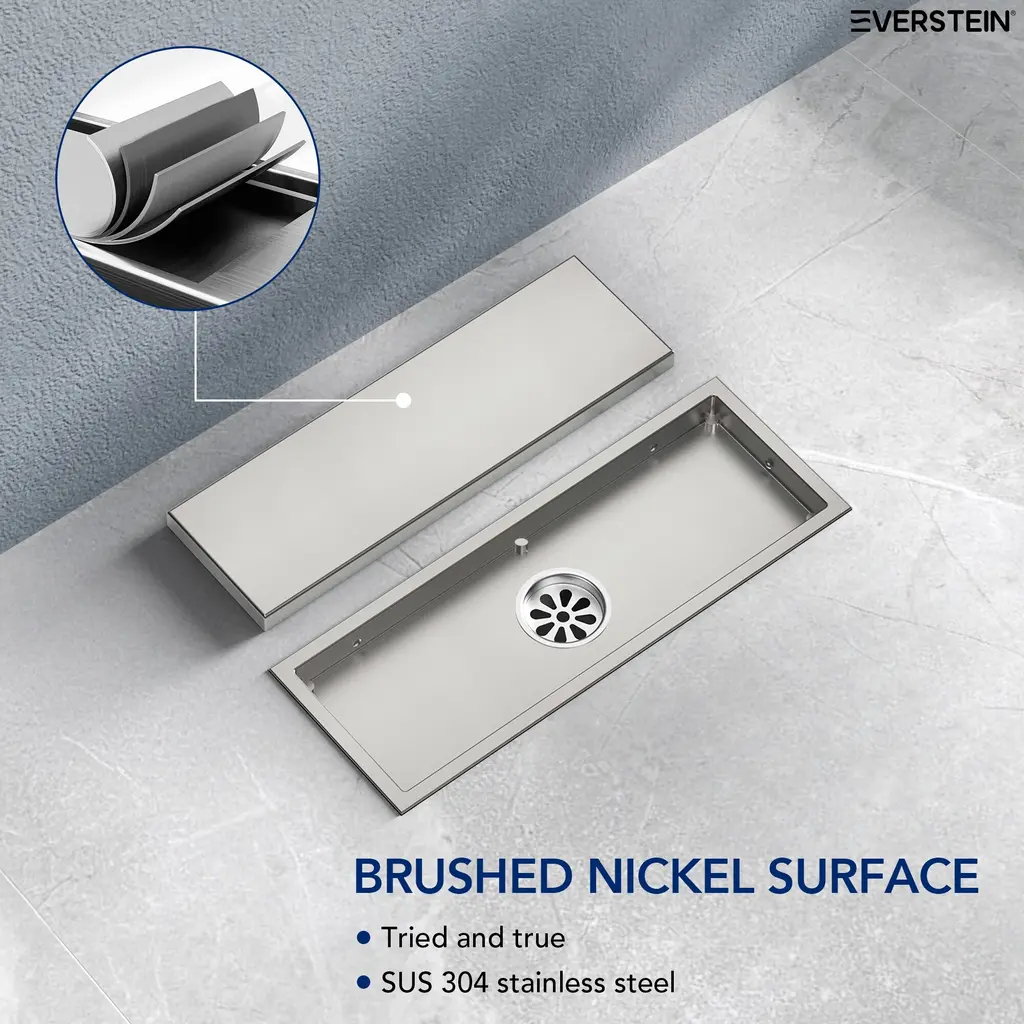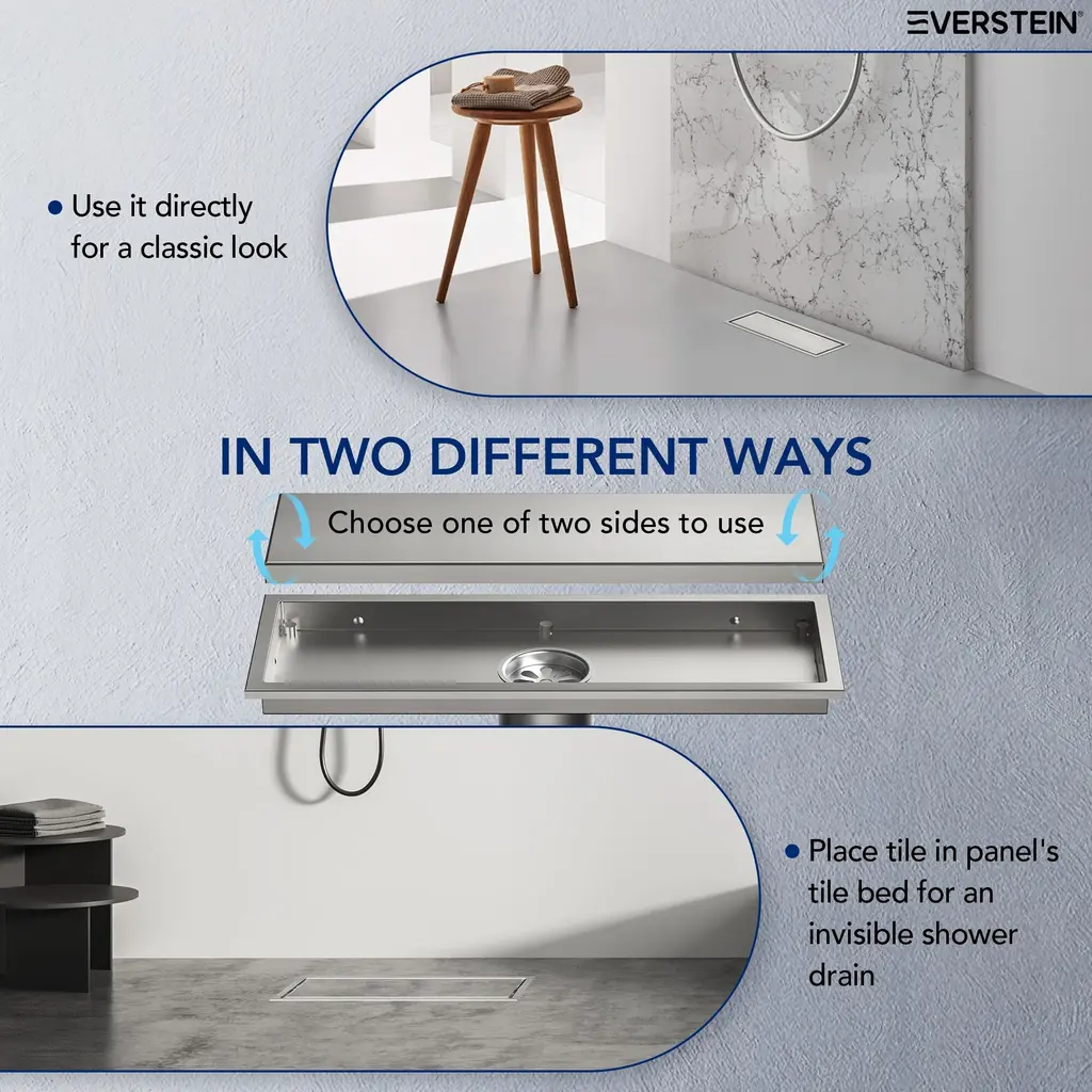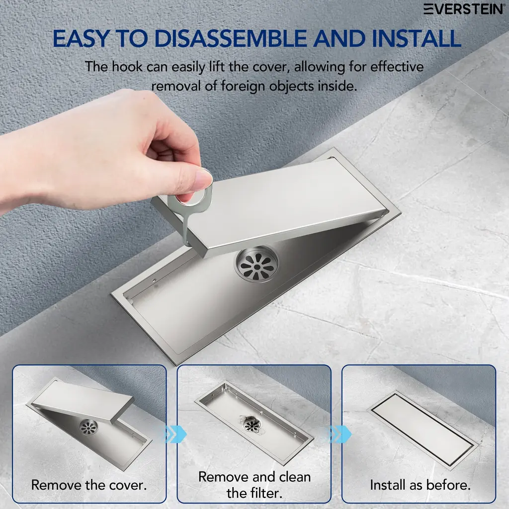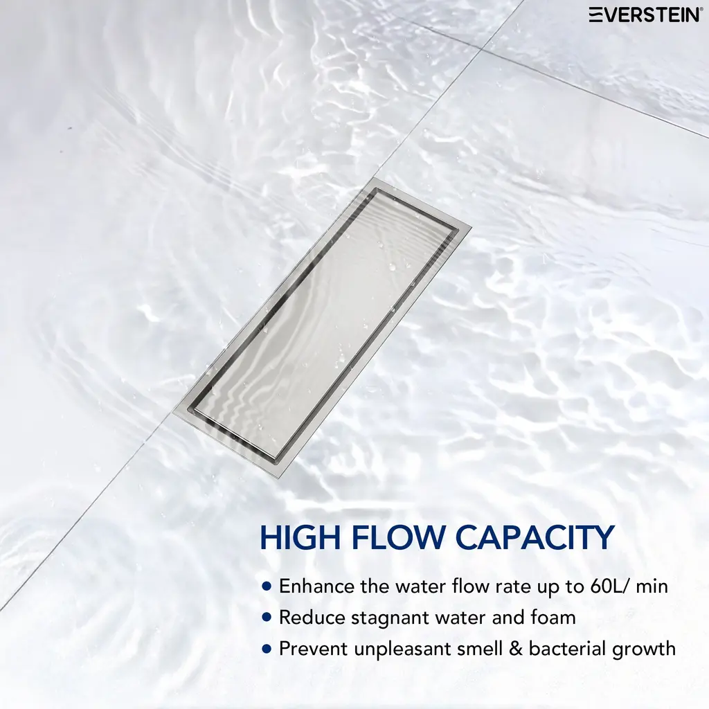 This linear shower drain is designed to deliver efficient water drainage with added features for convenience and durability. Equipped with a built-in hair strainer, it effectively captures debris to prevent clogging, ensuring smooth water flow and reducing maintenance efforts. The diameter of outlet is 2", high displacement with an average of 60 l/min. Ideal for use in bathrooms, showers, kitchens, swimming pools, balconies, garages, basements, toilets, and even outdoor areas, the EVERSTEIN floor drain ensures a smooth and hygienic drainage system for your home or commercial space. Feature:After-Sales Warranty: EVERSTEIN provide a lifetime warranty that covers all issues not resulting from human error or accidental damage, with customer service support, ensuring a seamless and worry-free experience from product selection to installation.