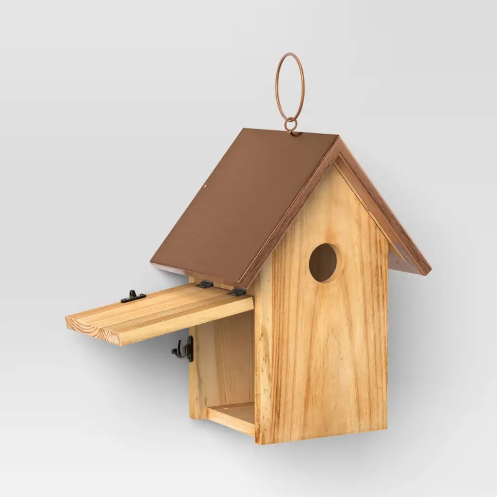 Create a cozy retreat for local birds with this Metal and Wood Bird House from Threshold™. Made of wood with a natural finish, this rustproof bird house features a brown metal roof, enhancing the charm of your garden. This bird house is designed with a circular hole for birds to enter and a door with a latch for easy cleaning. Plus, it comes with a circular top loop to hang around the garden. Threshold™: Looks like home, feels like you.
