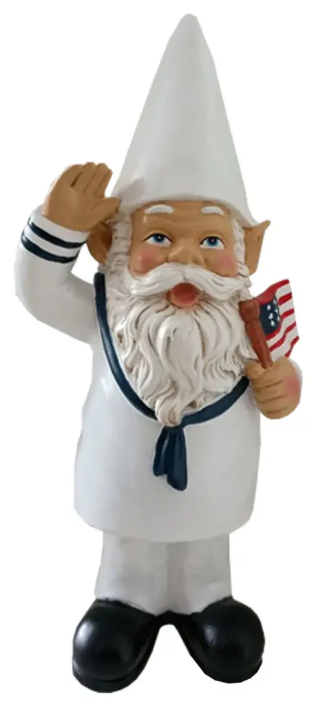 Show your appreciation for our brave and hardworking service men and women with this wonderful Navy Gnome figurine. Standing straight and proud while holding an American flag, this patriotic little gnome knows who protects our country and our values, and honors their work and sacrifice with his salute. Made of long lasting resin and beautifully hand painted, this 12" Navy Gnome is sure to provide many seasons of pleasure.