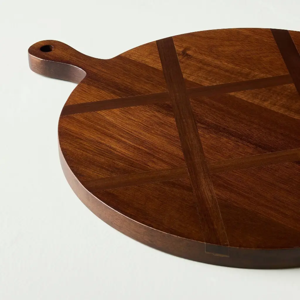 Surprise your family members or friends with freshly baked pies, desserts and more served on the Round Serve Board from Hearth & Hand™ with Magnolia. This round serving board features a plaid inlay to add a classic touch to your tablescape. Made of wood, it's great for everyday or occasional dining, and it has a built-in handle for convenient holding and a hole for easy hanging.Hearth & Hand™ with Magnolia: Gather • Create • Enjoy