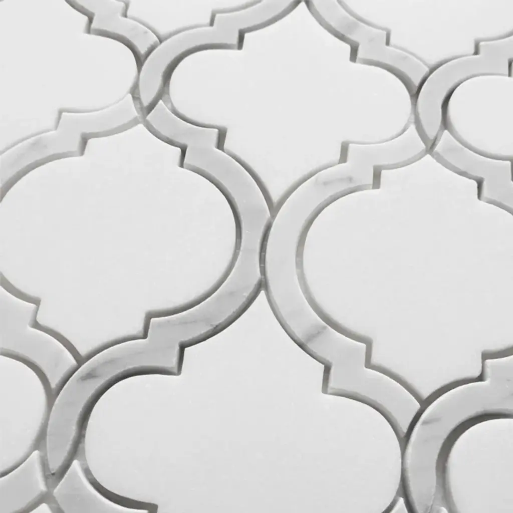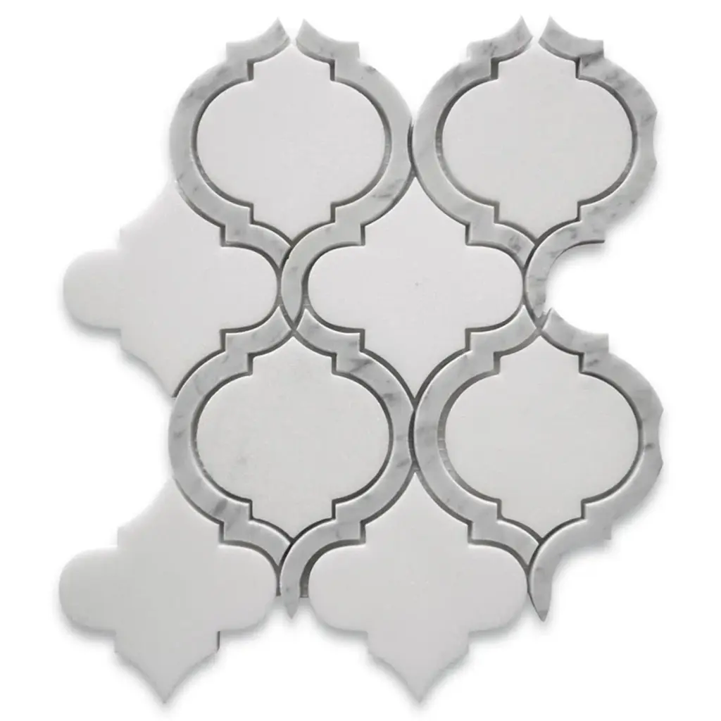 Premium Grade White Thassos Marble Mosaic Tile w/ Carrara White Outline. Greek Thassos White Pure White Crystal Marble Honed Grand Waterjet Arabesque Baroque Lantern w/ Carrara White Outline Mosaic Wall & Floor Tiles are perfect for any interior projects. The Grand Thassos White Marble Waterjet Lantern Mosaic tiles can be used for a kitchen backsplash, bathroom flooring, shower surround, dining room, entryway, spa. Our timeless Matte White Thassos Marble Arabesque Baroque Lantern w/ Carrara White Outline Mosaic tiles with a large selection of coordinating products is available and include arabesque, fish scale, penny round, herringbone, basketweave mosaics, 12x12, 18x18, 12x39, subway tiles, moldings, borders, and more.
