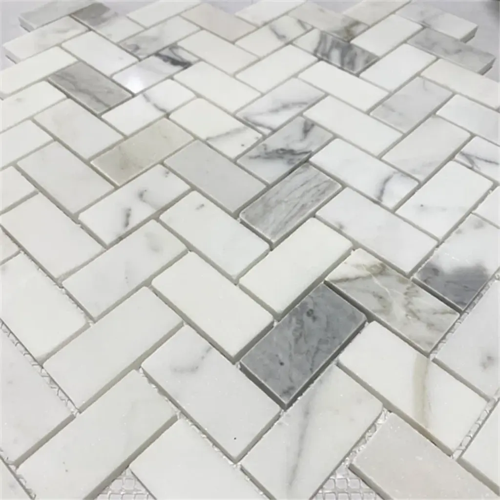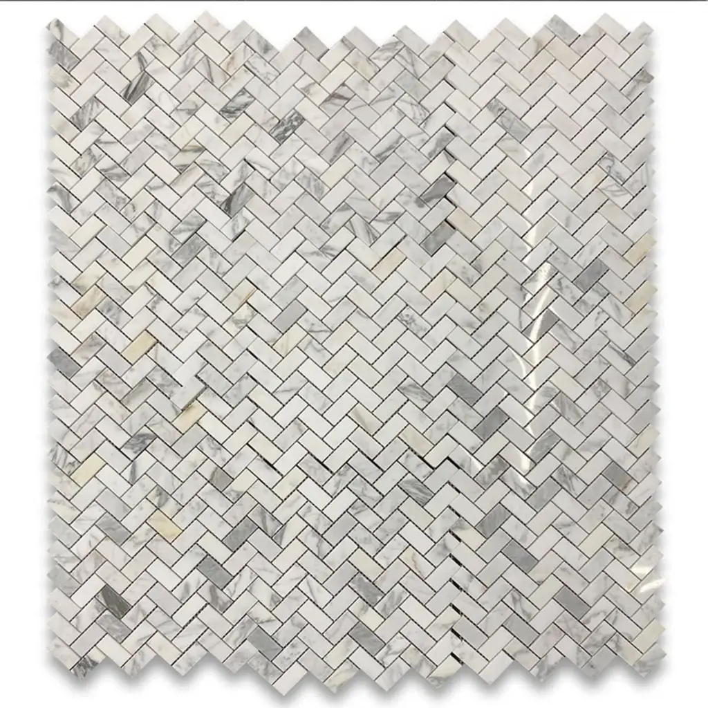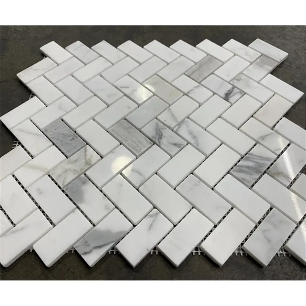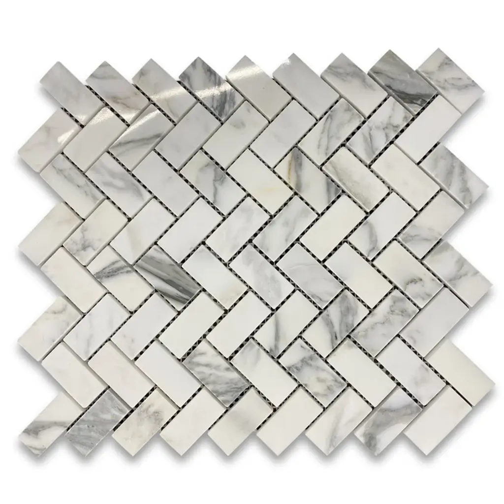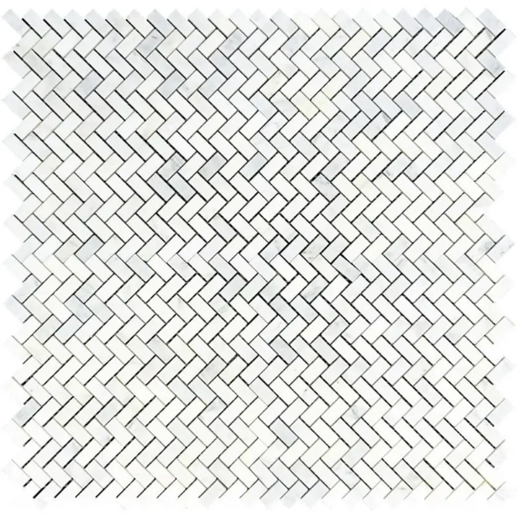 Premium Grade 1x2 Herringbone Statuary White Marble Mosaic Tile. Italian Statuary Statuario White Marble Polished 1 x 2 Herringbone Mosaic Wall and Floor Tiles are perfect for any residential / commercial projects. The Statuary Statuario Arabescato White Marble 1x2 Herringbone Mosaic Tile can be used for kitchen backsplash, bathroom flooring, shower surround, dining room, entryway, corridor, kitchen backsplash, spa, etc. Our timeless Glossy Statuary White Marble 1x2 Herringbone Mosaic Tile with a large selection of coordinating products is available and includes hexagon, brick, basketweave mosaics, 12x12, 18x18, 24x24, subway tile, moldings, borders, and more. Please note that natural stone does vary in pattern and color, so each piece will be unique, which is part of what makes natural stone such a beautiful and interesting material. The picture is representative of one piece of marble and your 1x2 Herringbone Mosaic Tile with a product may look different.