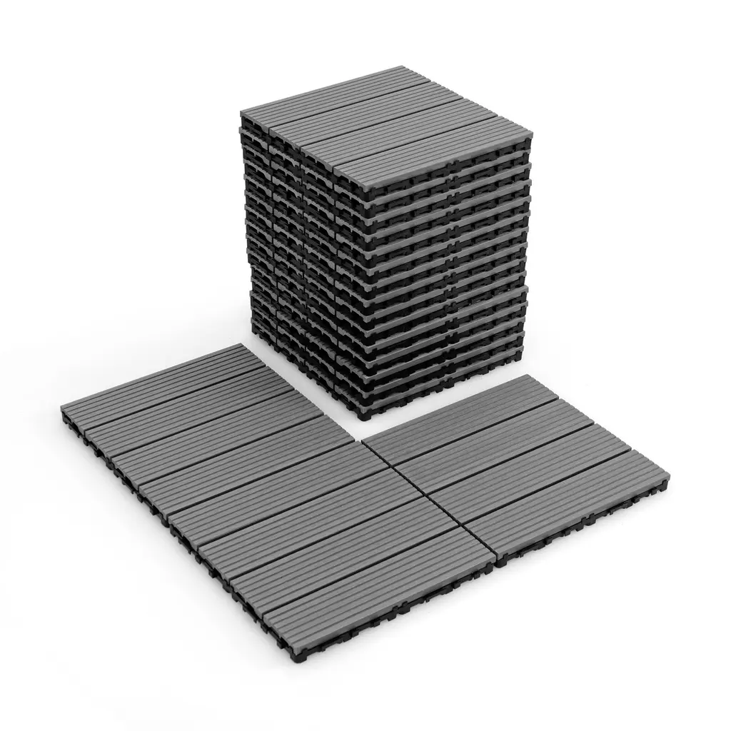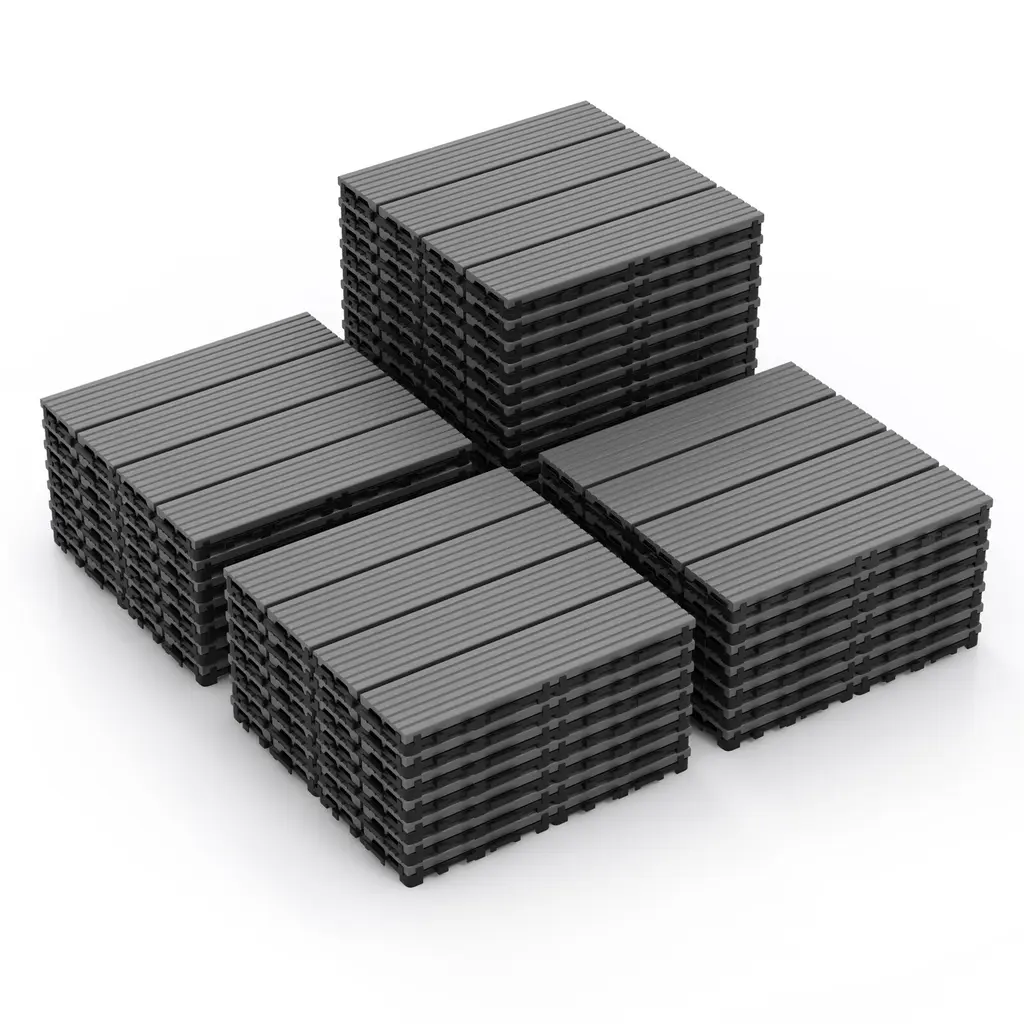 Specifications:Description:These upgraded deck tiles are crafted from weather-resistant WPC board with a PP bottom, offering four times the service life of ordinary plastic wood and withstanding sun, rain, and snow without warping. The tiles feature a simple snap-lock installation process—just align the snaps and press firmly to connect. Their easy-to-cut design allows for precise fitting in any area. The anti-slip surface ensures safety, particularly around poolside or in potentially slippery areas. With a natural wood finish and multiple splicing methods, these 18 interlocking tiles are versatile for various outdoor settings like patios, porches, balconies, backyards, gardens, and poolside areas. They are easy to maintain with waterproof, sun-proof surfaces that resist fading and a slatted design for effective drainage.Key Features:
