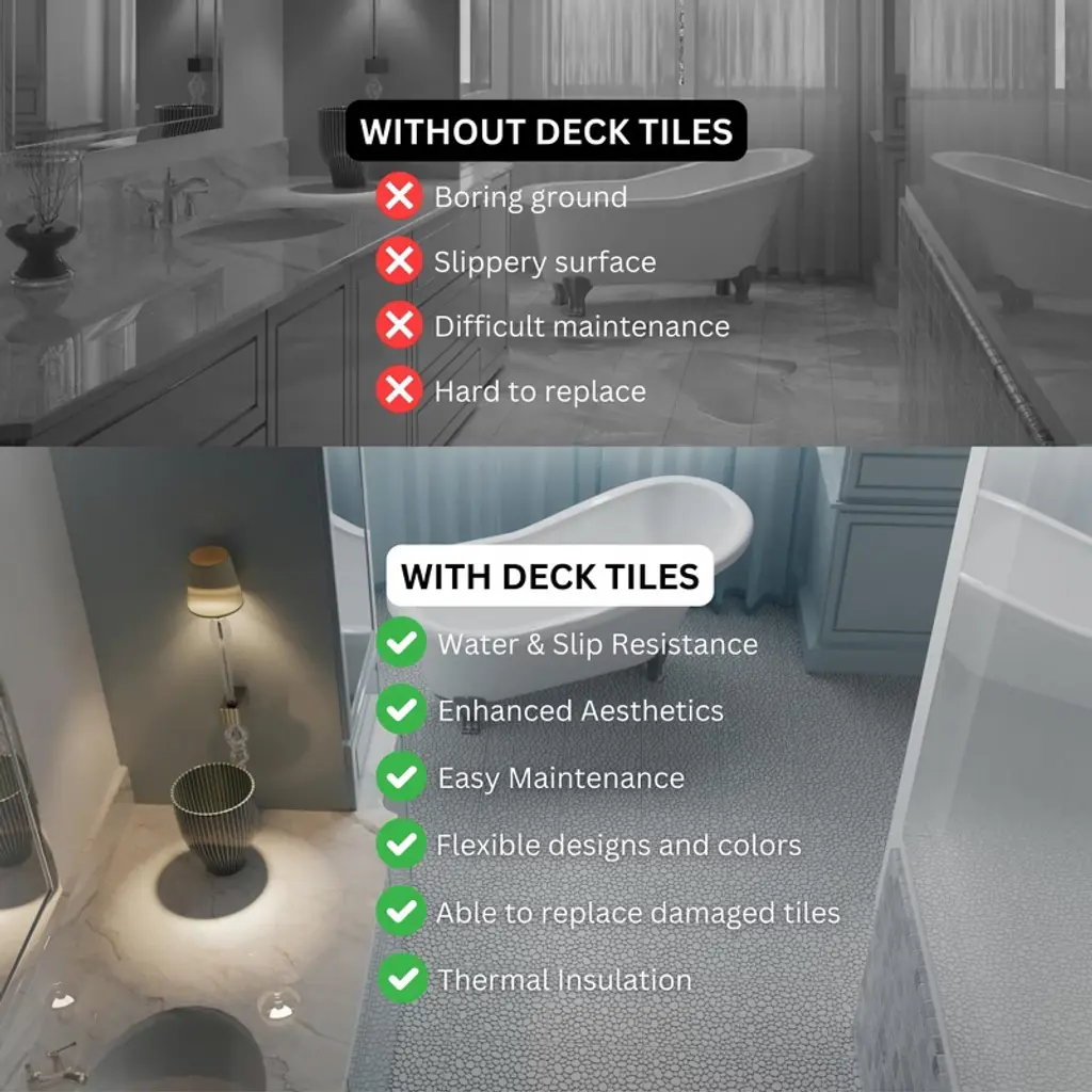 Depending on different lighting conditions,different environment and different recording device,the color of the product displayed is different. Product colors on our main photo were taken indoorswith standard lighting conditions -Before assembling these deck tiles,please make sure the underneathsurface is LEVEL and CLEAN of dirt and grime.Clean away rocks and weeds.These wood tiles are most easily installed over hard, flat surfaces like concrete or decking. Easytoassemblywithrubberhammer -Wood is a natural material thatwill age and requiresgradual cleanandmaintenance