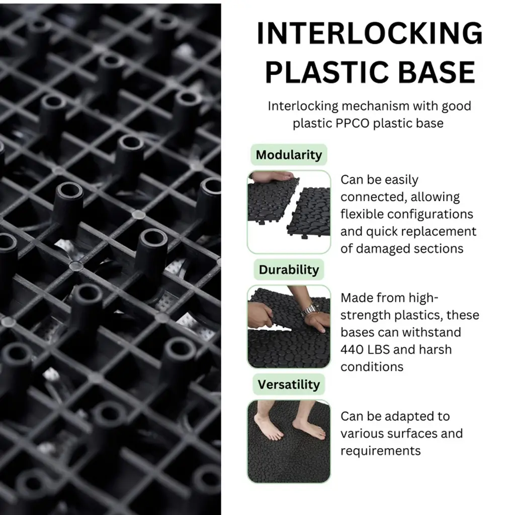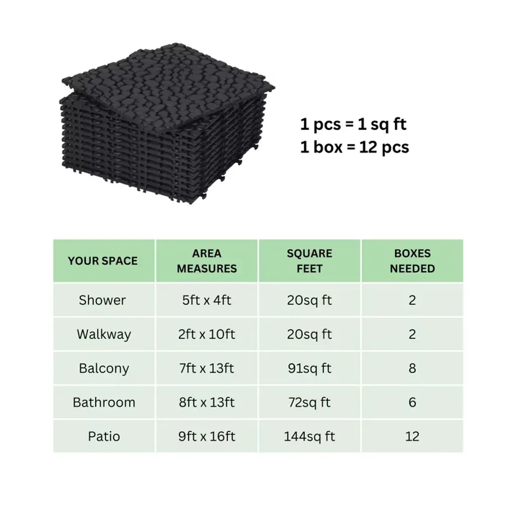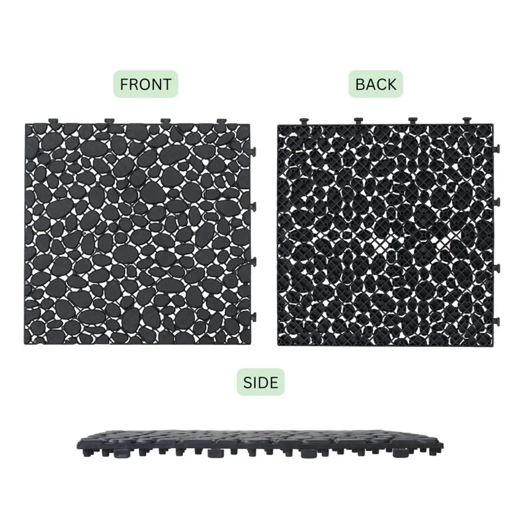 12 X 12 Inch Black Interlocking Deck Tiles With Pebble Stone Pattern, Waterproof Plastic Outdoor Decking, 12-pack