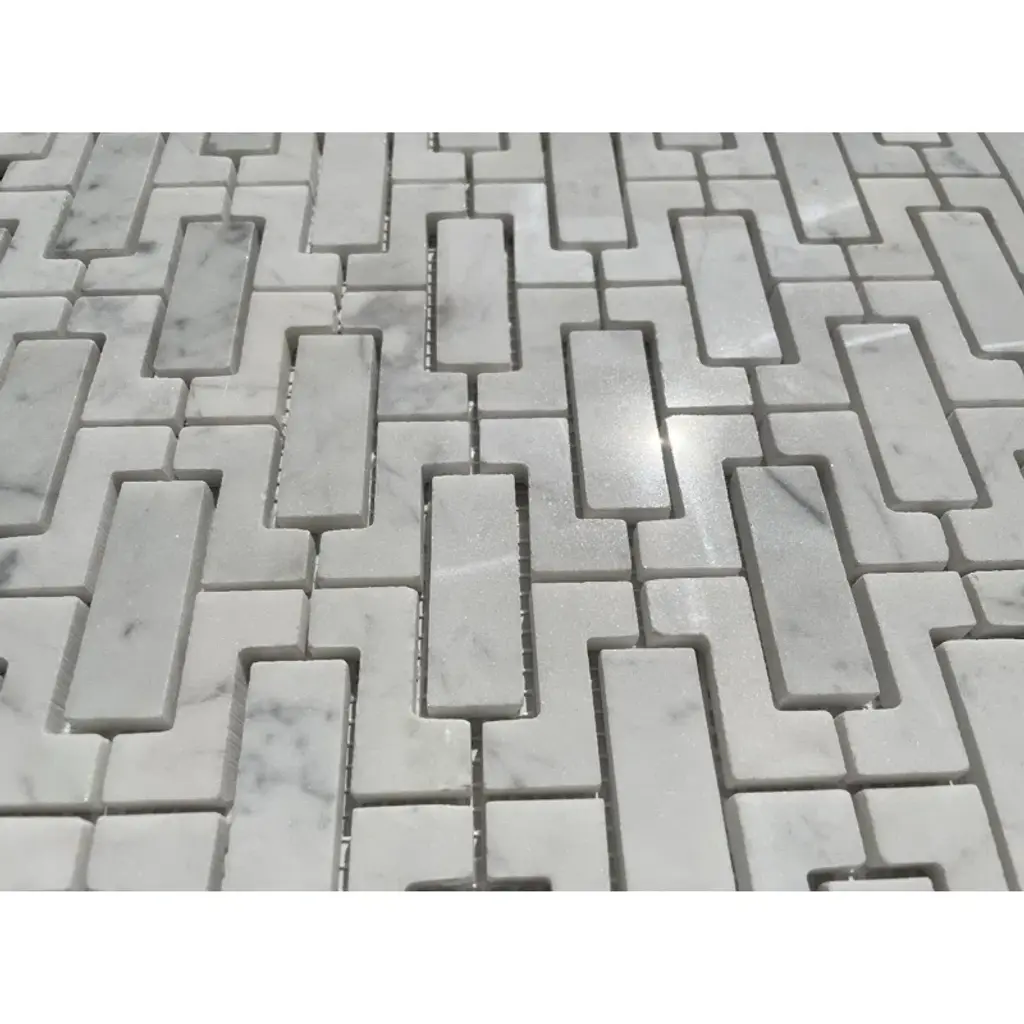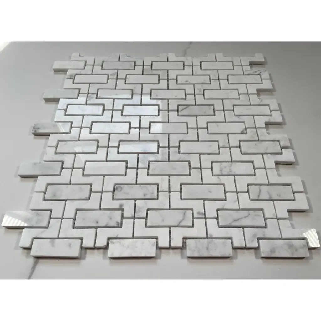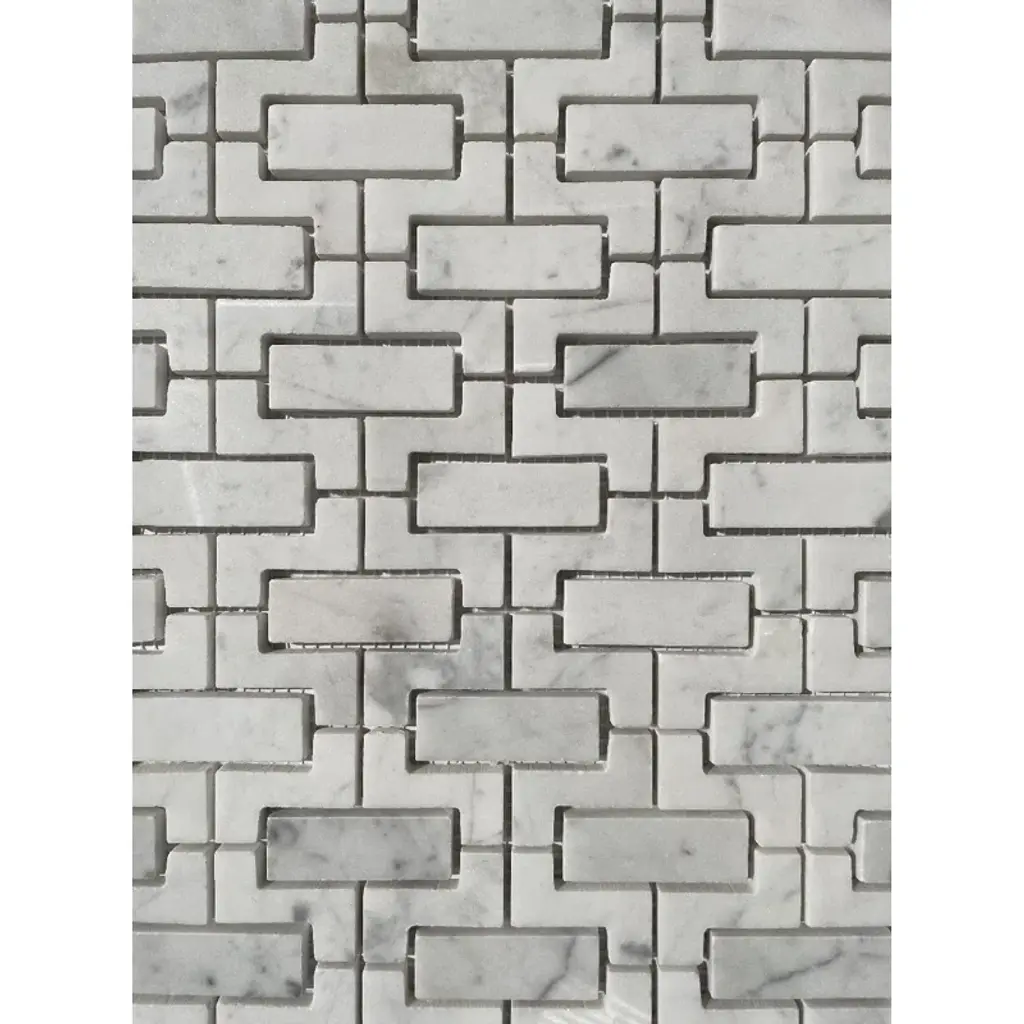 Premium Grade Fretwork Interlock Pattern White Carrara Marble Mosaic Tile. Italian Bianco Carrera White Venato Carrara Polished Fretwork Mosaic Wall and Floor Tiles are perfect for any residential / commercial projects. The Carrara White Marble Fretwork Interlock Mosaic Tile can be used for bathroom flooring, shower surround, kitchen backsplash, corridor, spa, etc.