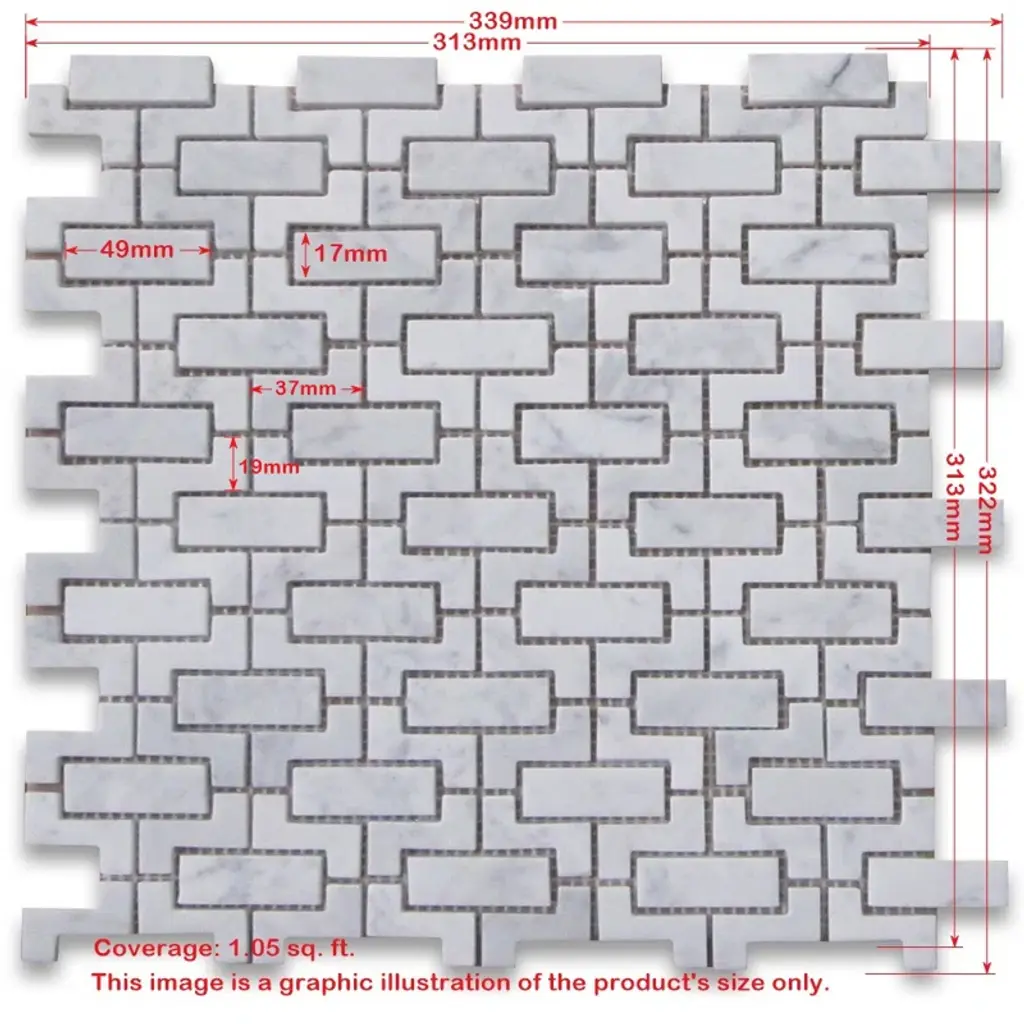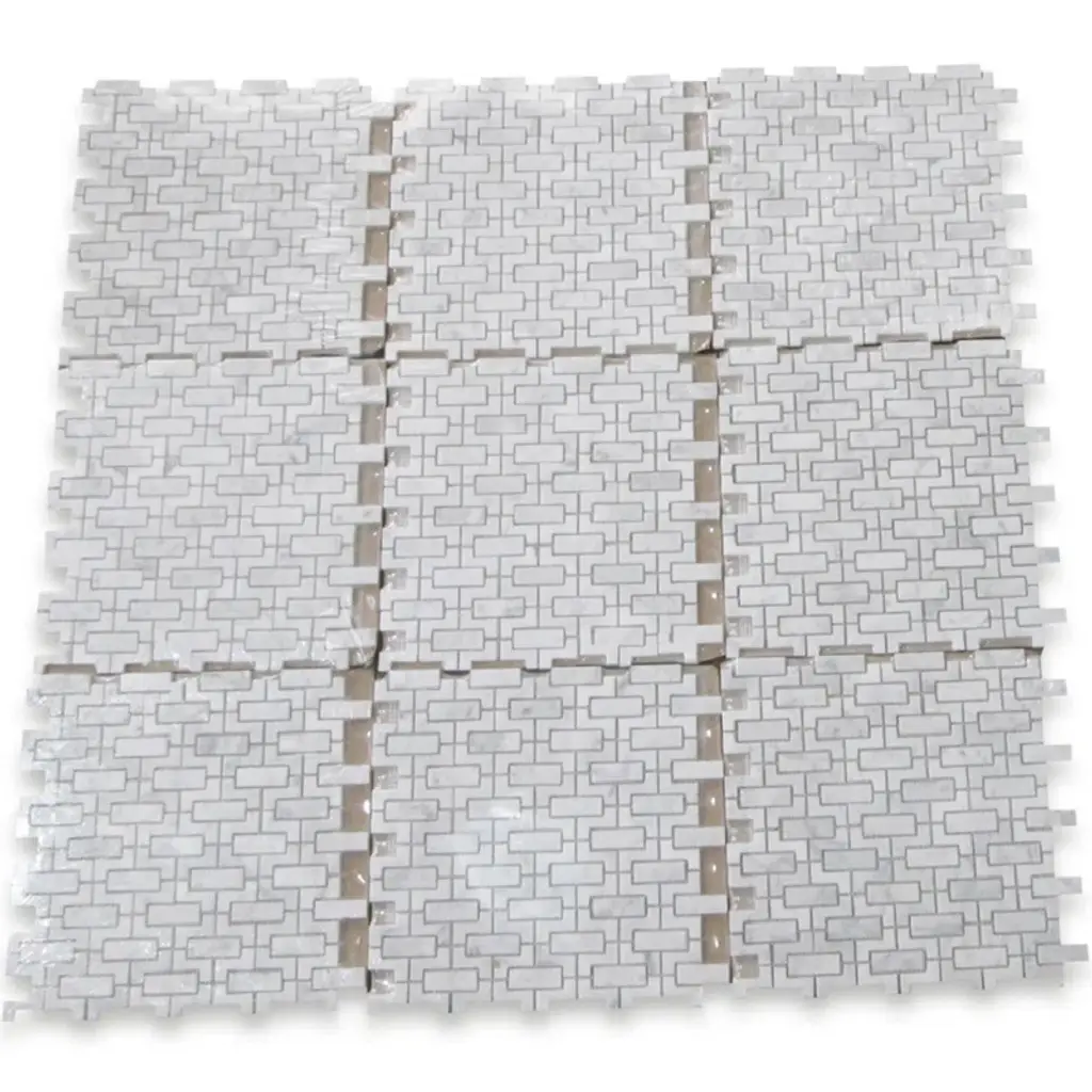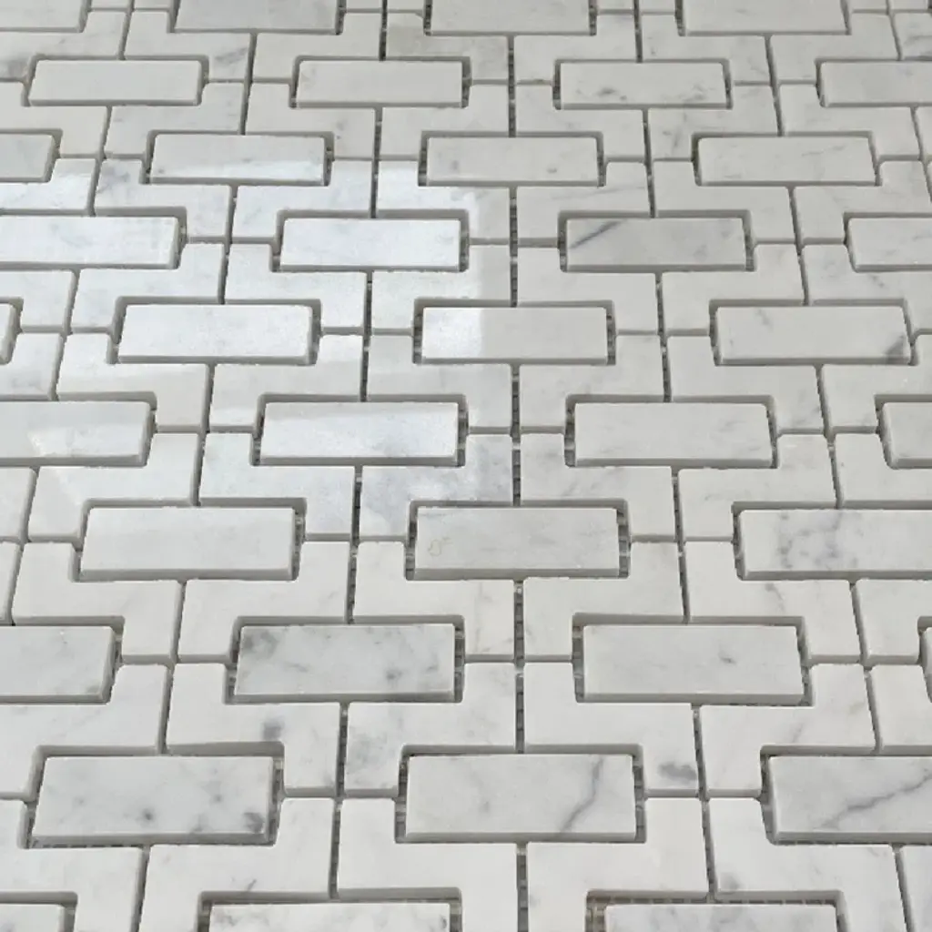 Premium Grade Fretwork Interlock Pattern White Carrara Marble Mosaic Tile. Italian Bianco Carrera White Venato Carrara Polished Fretwork Mosaic Wall and Floor Tiles are perfect for any residential / commercial projects. The Carrara White Marble Fretwork Interlock Mosaic Tile can be used for bathroom flooring, shower surround, kitchen backsplash, corridor, spa, etc.