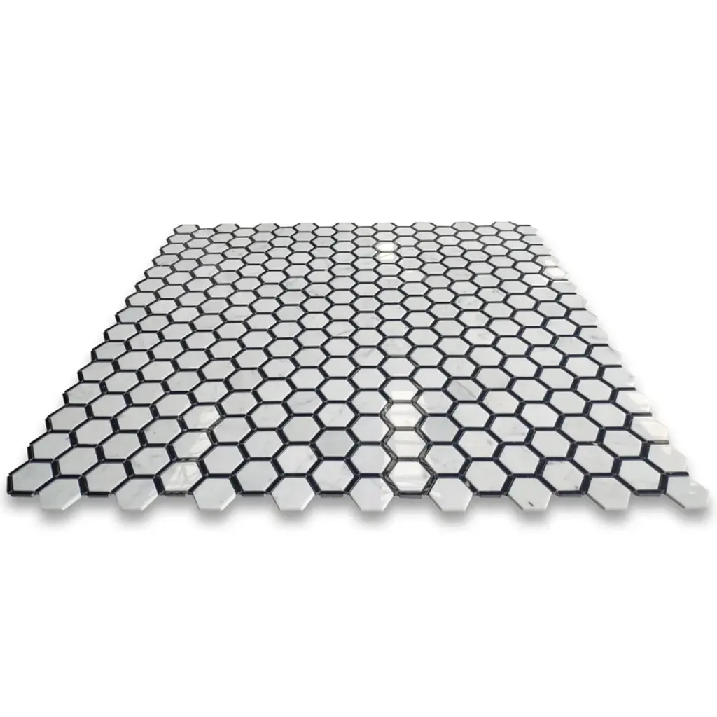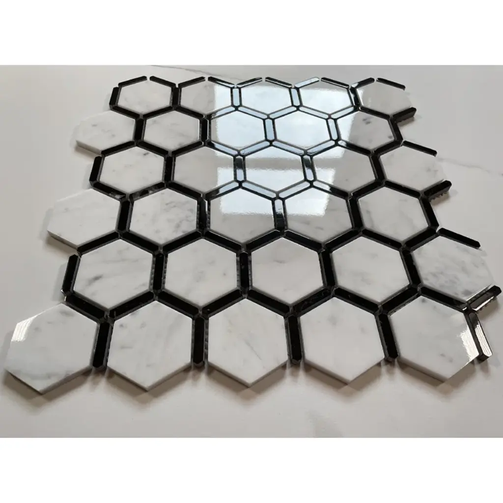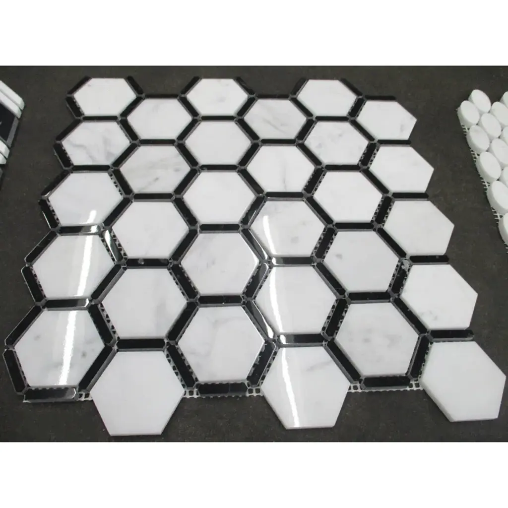 Premium Grade Carrara White Marble Hexagon and Nero Marquina Black Strips Mosaic Tiles. Italian Carrara Venato Bianco Carrera White Marble Polished 2-inch Hexagon w/ Nero Marquina Black Strips Mosaic Wall & Floor Tiles are perfect for any interior project. The 2-inch Carrara White Marble Hexagon Framed Mosaic tiles can be used for a kitchen backsplash, bathroom flooring, shower surround, dining room, entryway, or spa.