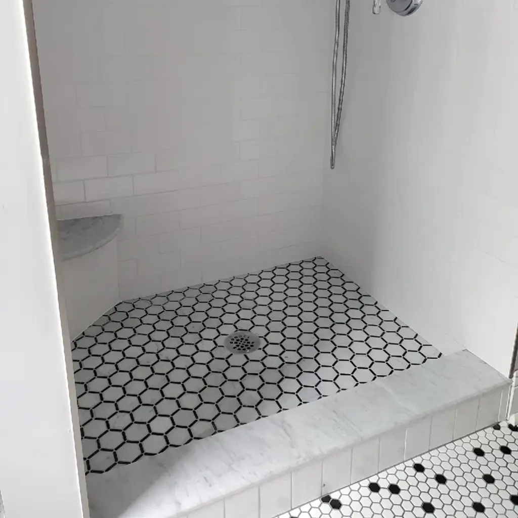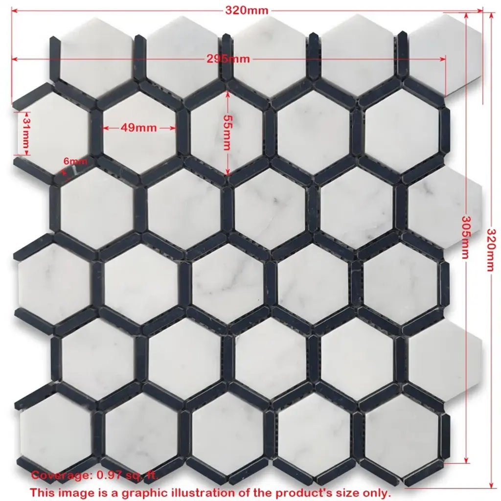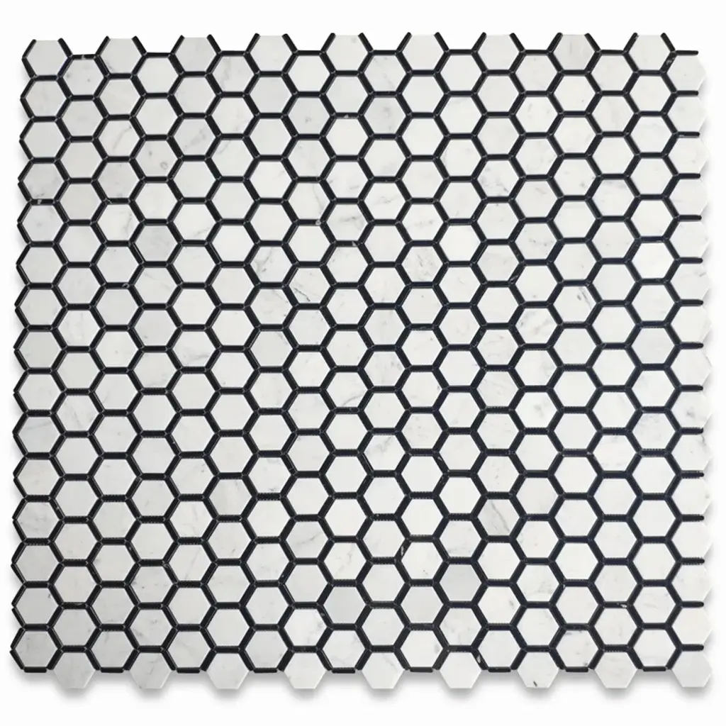 Premium Grade Carrara White Marble Hexagon and Nero Marquina Black Strips Mosaic Tiles. Italian Carrara Venato Bianco Carrera White Marble Polished 2-inch Hexagon w/ Nero Marquina Black Strips Mosaic Wall & Floor Tiles are perfect for any interior project. The 2-inch Carrara White Marble Hexagon Framed Mosaic tiles can be used for a kitchen backsplash, bathroom flooring, shower surround, dining room, entryway, or spa.