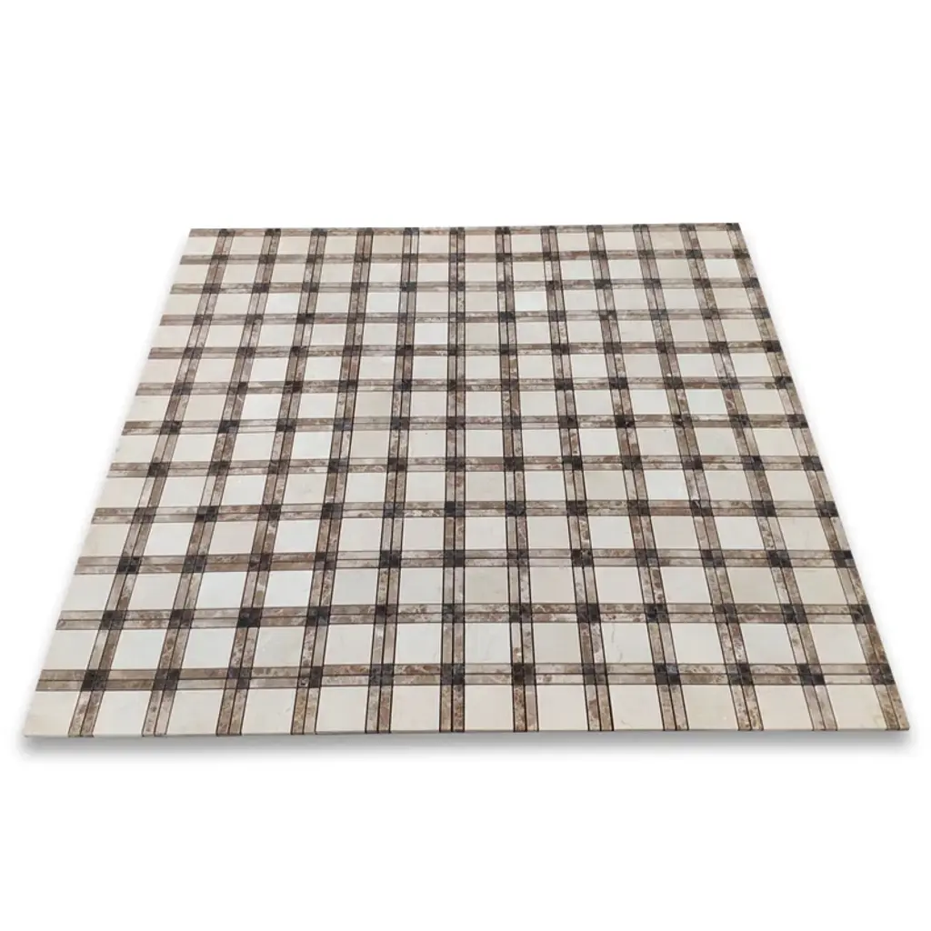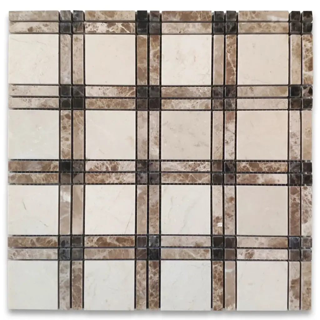 Premium Grade Crema Marfil Marble Plaid Tartan Mosaic Tiles w/ Emperador Brown. Spanish Crema Marfil Marble Polished Plaid Tartan Mosaic Wall & Floor Tiles are perfect for any interior projects. The Crema Marfil Marble Plaid Tartan Mosaic tiles can be used for a kitchen backsplash, bathroom flooring, shower surround, dining room, entryway, spa. Our timeless Glossy Crema Marfil Marble Plaid Tartan Dark Brown Emperador Light Brown Mosaic tiles with a large selection of coordinating products is available and include arabesque, fish scale, penny round, herringbone, basketweave mosaics, 12x12, 18x18, 12x33, subway tiles, moldings, borders, and more.
