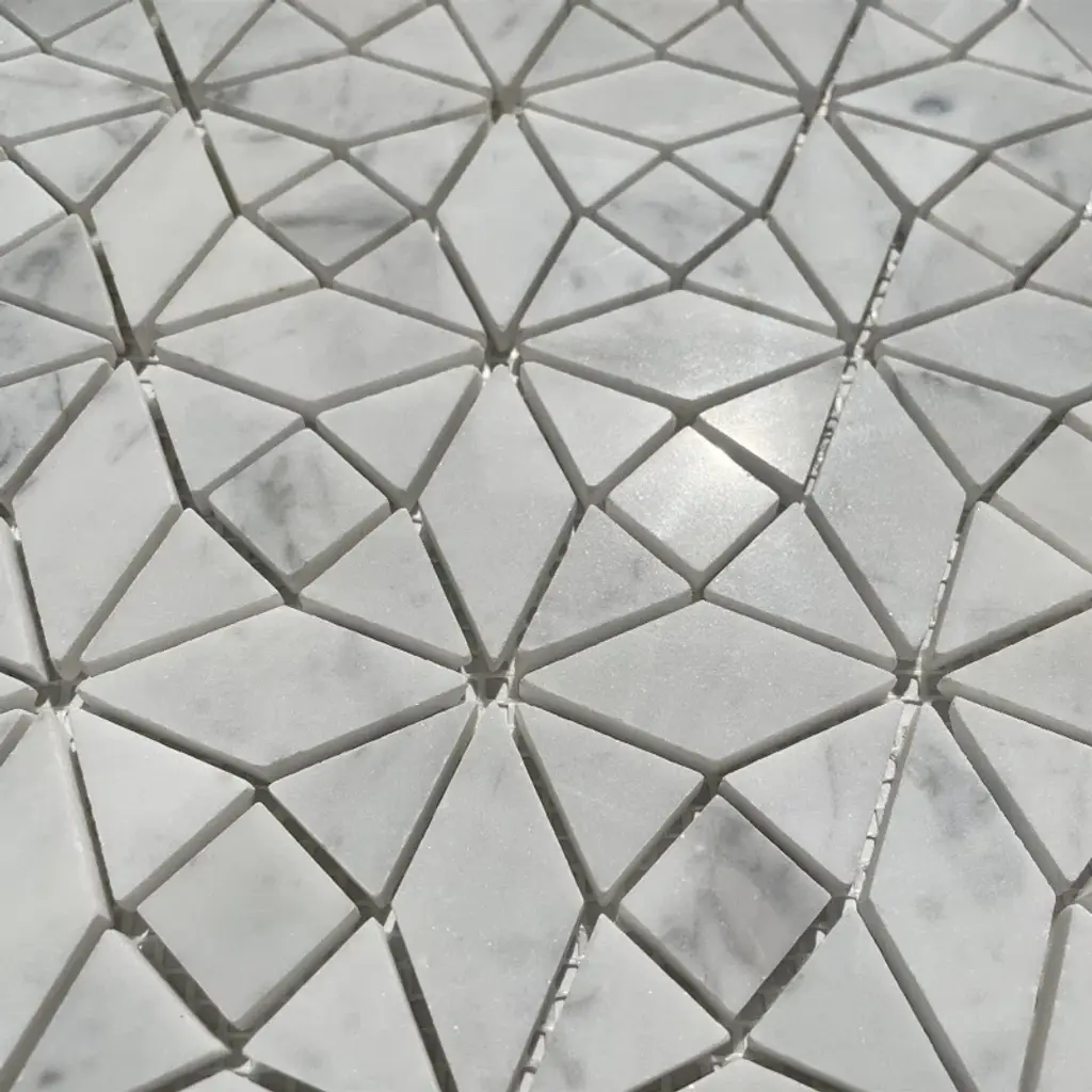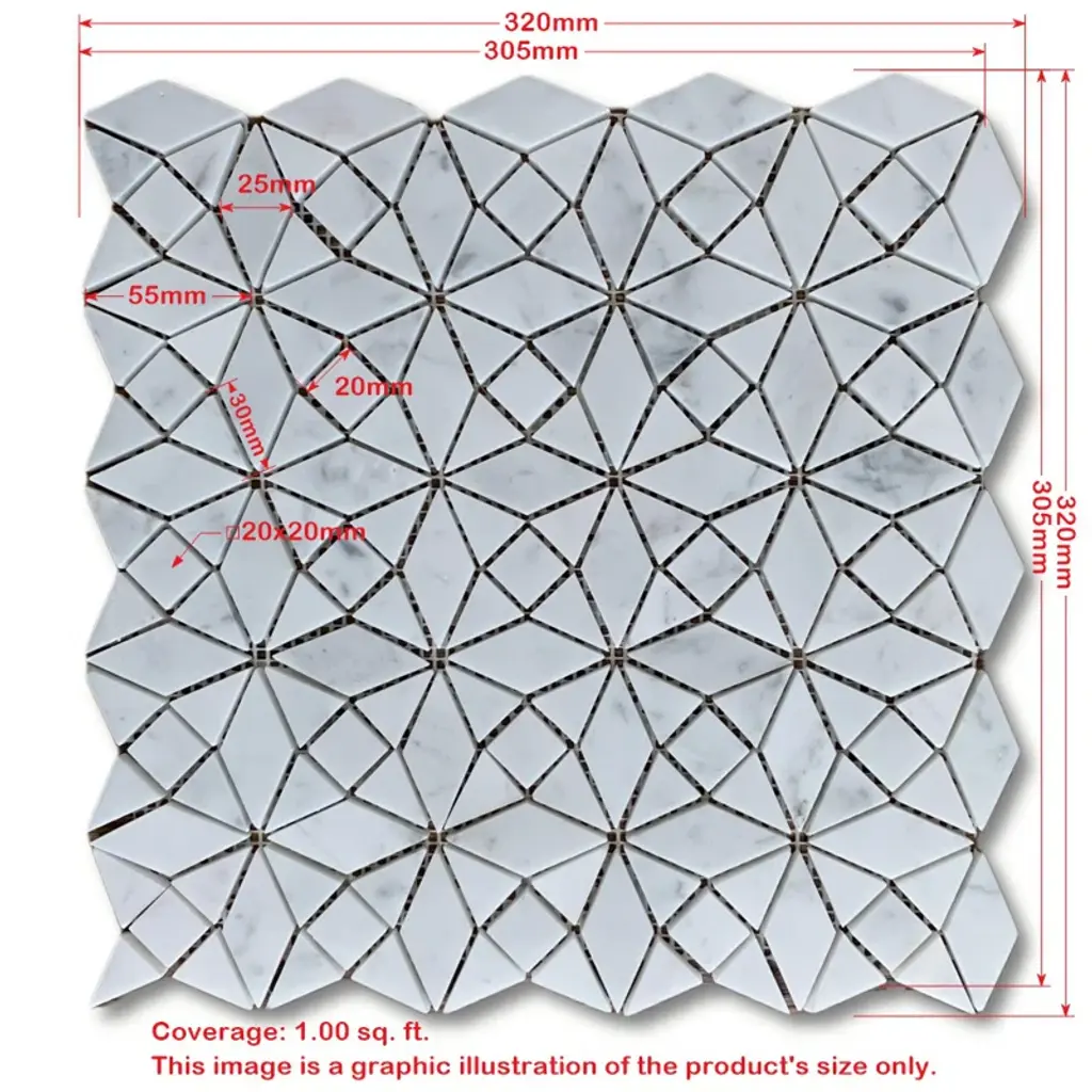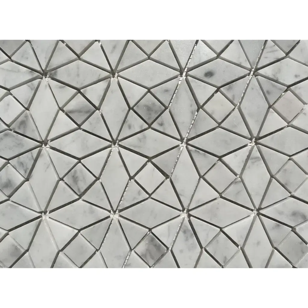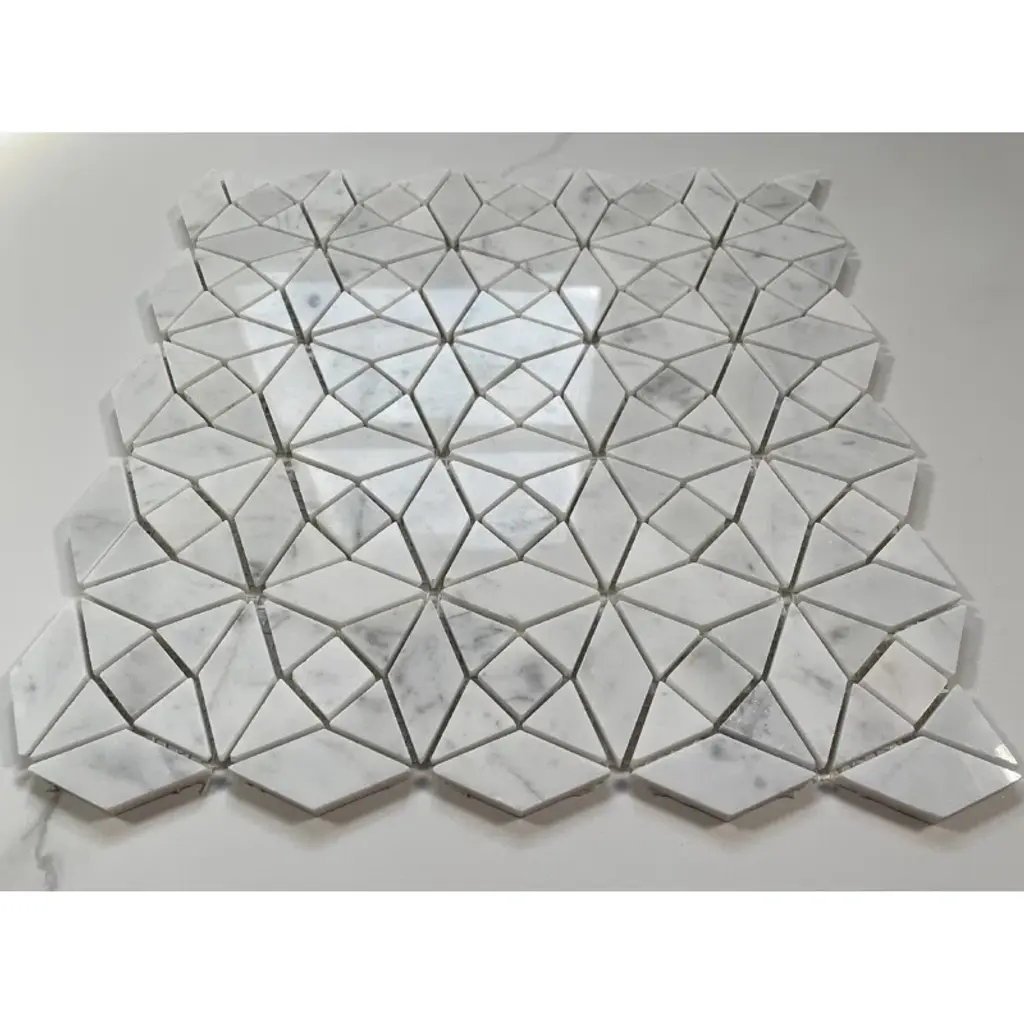 Premium Grade Kaleidoscope Pattern White Carrara Marble Mosaic Tile. Italian Bianco Carrera White Venato Carrara Polished Kaleidoscope Pattern Diamond Mixed Mosaic Wall and Floor Tiles are perfect for any residential/commercial projects. The Kaleidoscope Pattern Carrara White Marble flower Shape mosaic Tile can be used for kitchen backsplash, bathroom flooring, shower surround, dining room, entryway, corridor, kitchen backsplash, spa, etc.