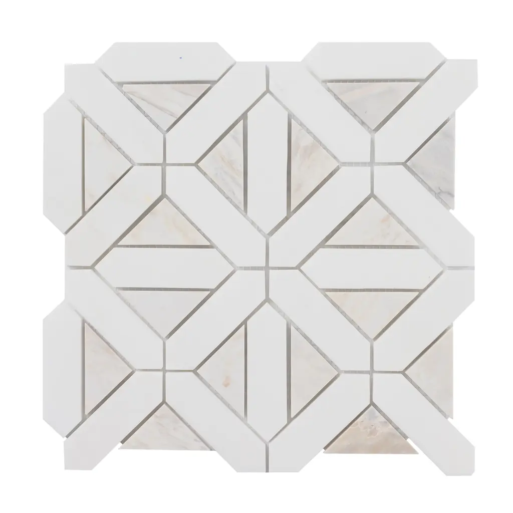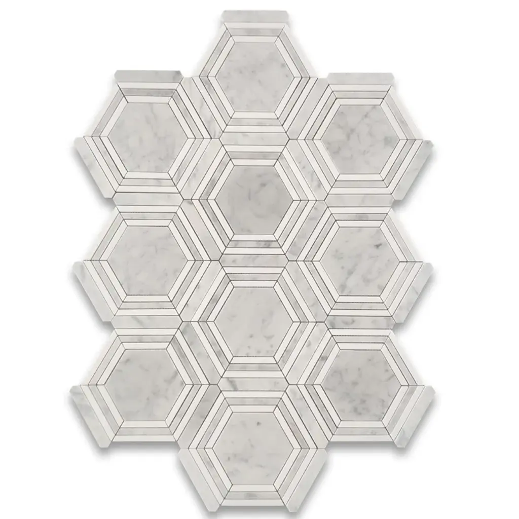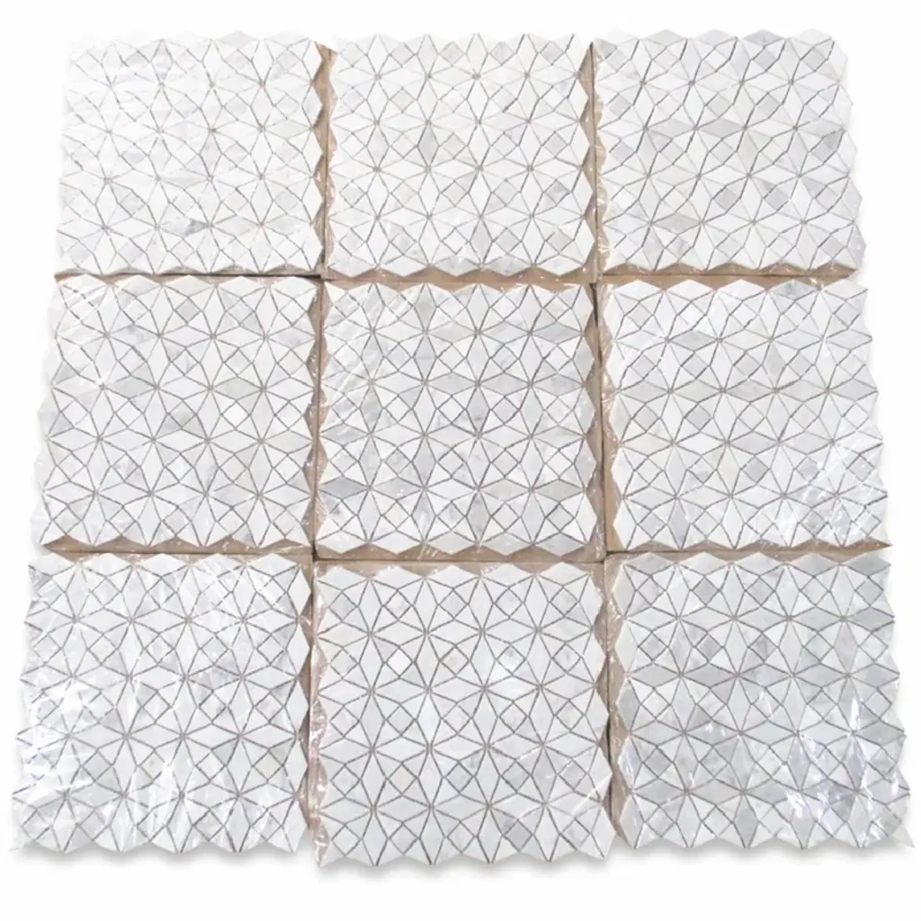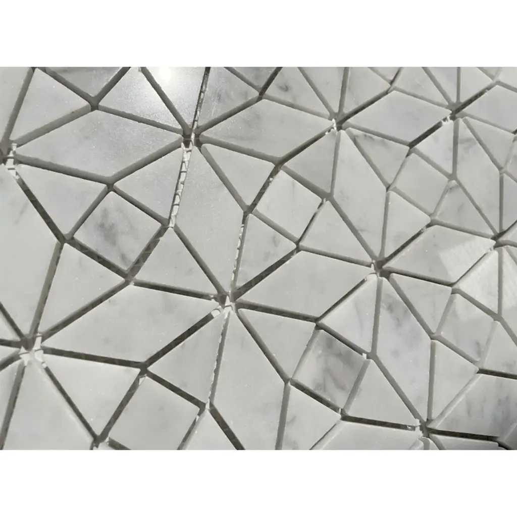 Premium Grade Kaleidoscope Pattern White Carrara Marble Mosaic Tile. Italian Bianco Carrera White Venato Carrara Polished Kaleidoscope Pattern Diamond Mixed Mosaic Wall and Floor Tiles are perfect for any residential/commercial projects. The Kaleidoscope Pattern Carrara White Marble flower Shape mosaic Tile can be used for kitchen backsplash, bathroom flooring, shower surround, dining room, entryway, corridor, kitchen backsplash, spa, etc.