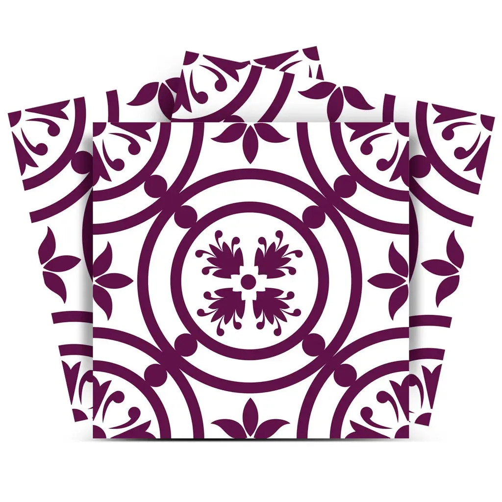 The possibilities are endless with these 12" X 12" Merlot Lisa Removable Peel and Stick Tiles stickers. These fabulous peel and stick tiles will add lots of color, sophisticated flair, and fun design to your kitchen backsplash, fireplace mantel, stair treads, half wall, bathroom or nook. These 12" square tile stickers in multiple bright fun colors and designs are an easy, no mess solution to complete a personalized and colorful room makeover. Easy to apply on any clean dry flat surface, and easy to remove. Multi use and multi-room appeal make this design option is perfect for renters, landlords, college students and homeowners alike. Peel and stick tile decals make it easy to turn your space into a home. Removable without damage to surfaces. One kit contains 24 stickers. Kit includes multiple styles that can be arranged in any patterning you choose.Coastal style in vibrant violet color.Easy to install peel and stick mosaic tiles.Impervious to water for bathroom use.Made of durable vinyl material.Square shaped tiles with a glossy surface.Stunning Arabesque mosaic pattern.