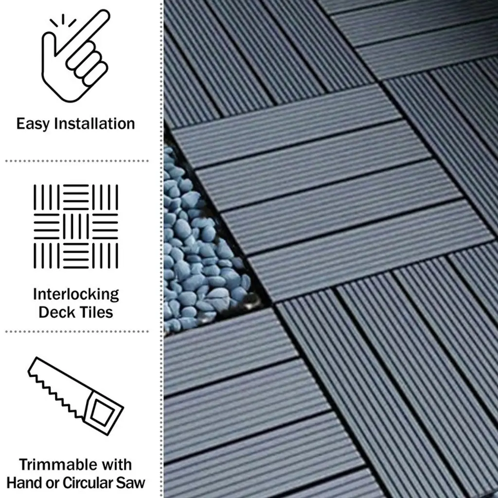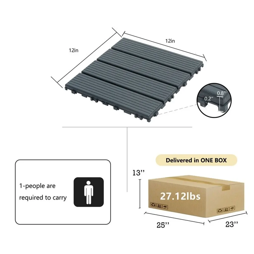 Description:These tiles contain unparalleled wisdom, not only significantly improve the friction, but also in the non-slip performance and durability to achieve a qualitative leap, can be called the outstanding representative of ingenuity. Every detail reveals the designer's extreme pursuit of craftsmanship and deep understanding of user experience, which makes people marvel. The subtleties are breathtaking, as if telling the relentless pursuit of beauty.FeatureDurable and Weatherproof: These plastic interlocking deck tiles are designed for all-weather outdoor environments. Made from high-quality PP material, they are known for their outstanding durability, and can withstand all kinds of harsh weather, maintaining their stability and initial luster for a long time to come, demonstrating their exceptional quality.Strong Load-Bearing Capacity: Interlocking terrace tiles, with their excellent load-bearing capacity, are used in a wide range of applications. Whether it's a narrow balcony or a spacious patio, it holds heavy furniture and foot traffic securely, and is durable enough to never bend or break. With its sturdy construction, this tile is ideal for designing outdoor spaces.Easy Installation: These patio deck tiles stand out with their simple snap-together design, making them easy to install without the need for any special tools or specialized skills. They fit together like a jigsaw puzzle, locking together securely and staying put on any surface.Suitable for Garden and Yard: These tiles, with their unique flavor, are undoubtedly the finishing touch to your patio and garden. They not only add warmth and elegance to the outdoor space, but also in every inch of the land painted a lifelike picture, people are mesmerized by it, linger.We provide one year warranty and product assembly video, please contact us if you have any questions!Weights & DimensionsProduct Size: 12"W x 12"DOne Tile Weight: 0.75 lbsWeight Capacity: 330 lbsMaterialFrame Material: PlasticUpholstered: NoCountry of Origin: ChinaInstructionsBecause the size of the product is measured manually, there may be errors.Items may slightly different from photo in terms of color due to the lighting during photo shooting or the monitor's display.