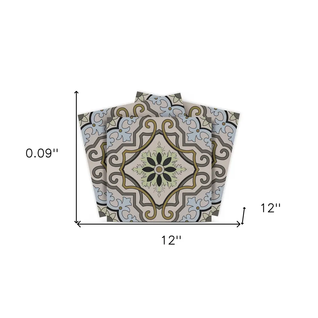 12" X 12" Taupe And Blue Scroll Peel And Stick Tiles - Light Blue