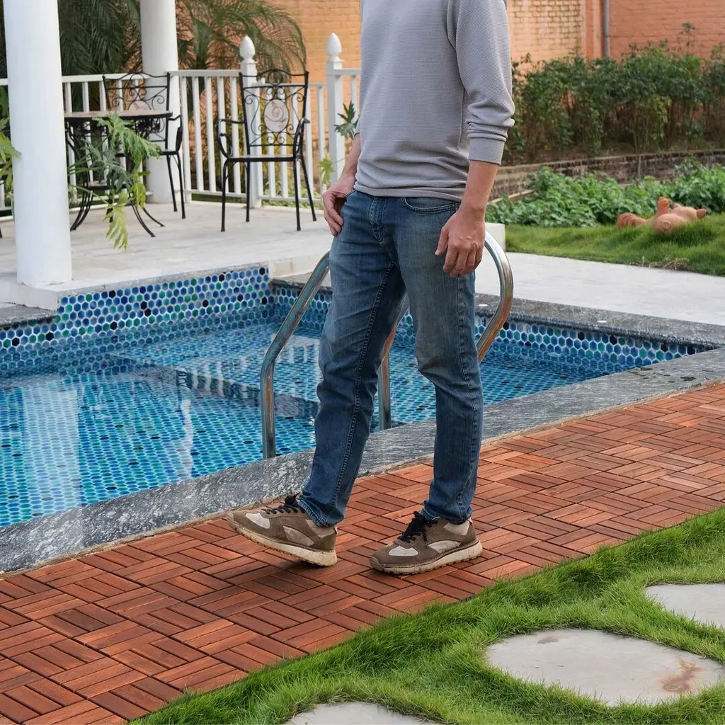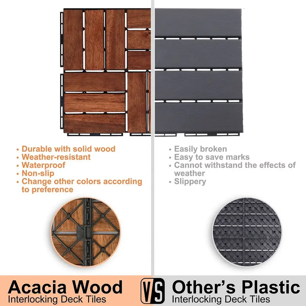 These Acacia Wood Interlocking Deck Tiles are a perfect solution for upgrading your outdoor spaces. Each tile measures 12" x 12" and is crafted from durable Acacia hardwood, finished with water-based oil to make them waterproof, mildew, and mold-resistant. Their checker pattern design adds a stylish touch to patios, balconies, or poolside areas. These tiles are easy to install with a rubber hammer and can be cut to fit corners or edges. The interlocking design ensures stability, while the plastic base allows proper drainage, making them ideal for rainy seasons.Features:Specifications: