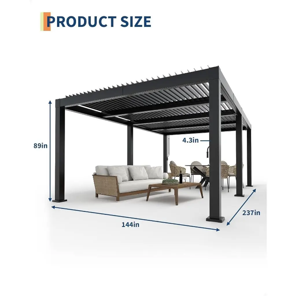 Upgrade your outdoor living space with this 12' x 24' all-aluminum louvered pergola, designed to match both style and performance for any home. Built fully from heavy-duty aluminum, its rust- and corrosion-resistant matte finish stands up to every season, keeping your patio or deck looking sharp year after year. The reinforced frame boasts 30% more aluminum than most, giving you peace of mind against high winds and heavy snow. With its adjustable louvers, controlling sunlight and airflow is as simple as turning a crank—enjoy shade on hot afternoons or open up for stargazing at night. Thanks to the innovative smart drainage system, rainwater flows effortlessly through hidden gutters down reinforced columns, so you never have to worry about leaks or pooling. This pergola is perfect for hosting backyard barbecues, relaxing poolside, or transforming your deck into a cozy outdoor retreat. Every detail, from pre-drilled plates to corrosion-proof hardware, ensures easy installation and lasting strength. Arriving in nine clearly labeled boxes with step-by-step video guides, assembly is stress-free—and if any issues arise, dedicated customer support is there to help.