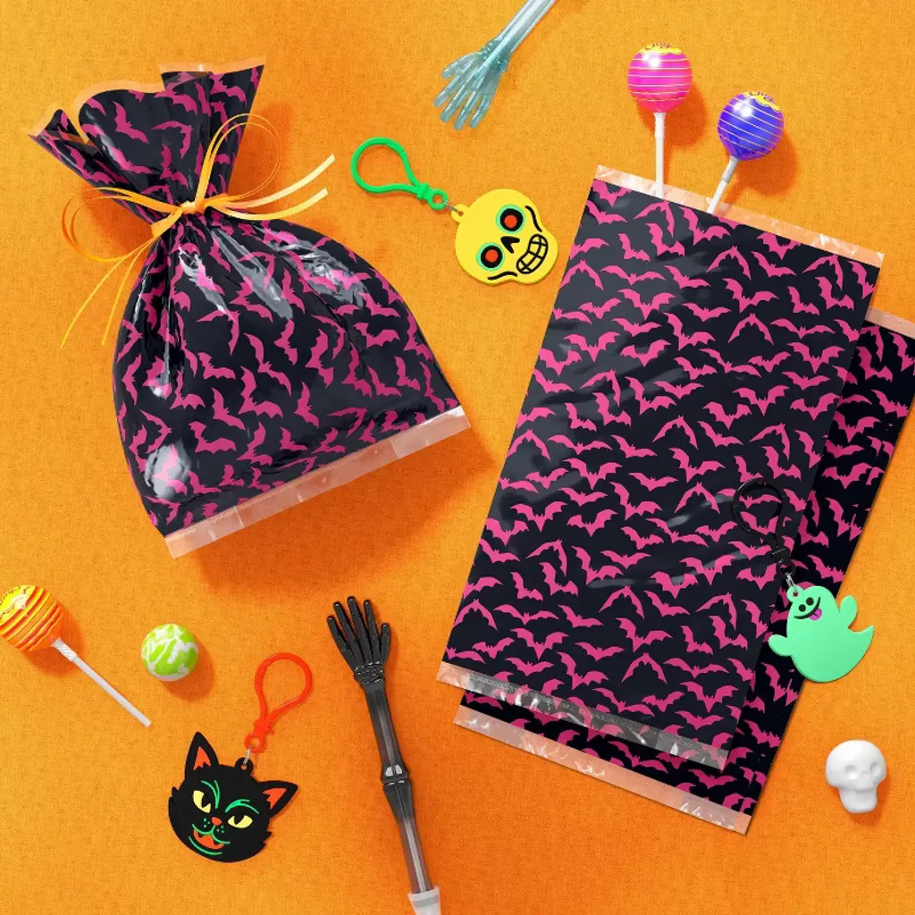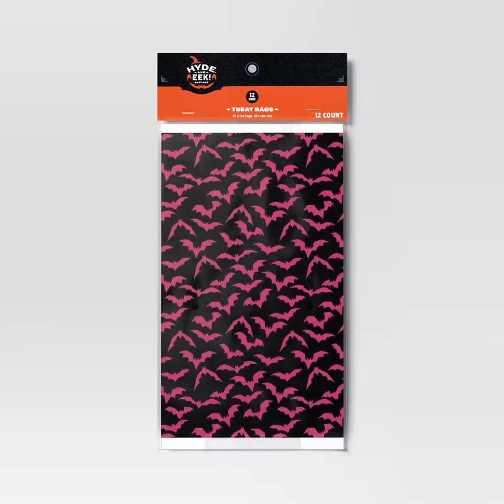 Delight your little ghouls and guests with these 12-Count Bat Cello Bag Party Favors from Hyde and EEK! Boutique™ This set includes 12 cello bags with twist ties, all adorned with a seamless print of pink bats popping from a black background, evoking an eerie delight. Stuff them with candy or small Halloween props and hand them out while hosting fall gatherings for kids or entertaining trick-or-treaters.Hyde and EEK! Boutique™: Thrilling delights. Curious oddities.