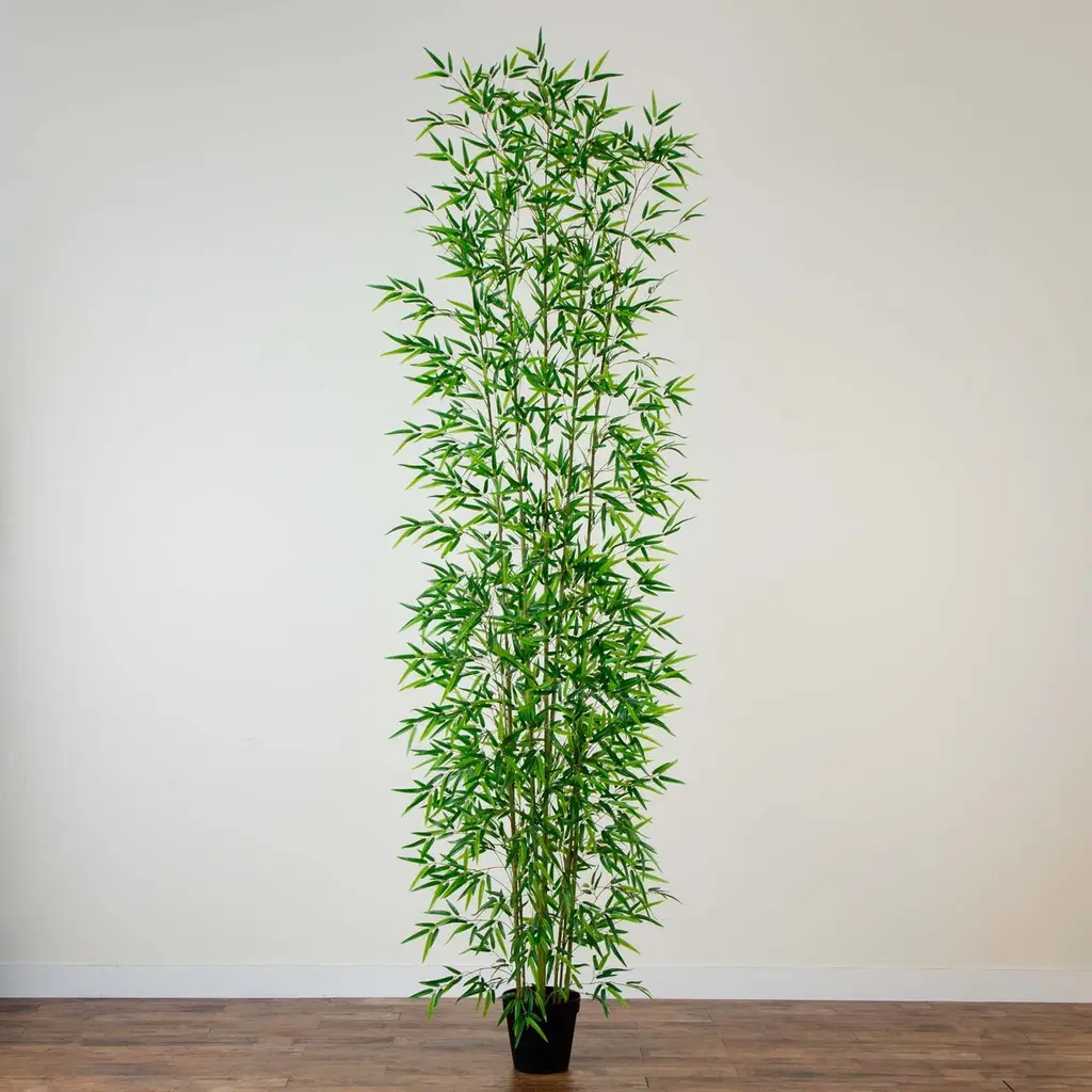 Embrace the serene beauty of Japan with our meticulously crafted bamboo tree, a proud emblem of the country's rich landscapes. Created by horticulturists with extensive travel in Japan, this piece captures the nuances and quirks of genuine bamboo - from the verdant leaves to the distinctive branches and stems. The lush canopy is yours to shape, allowing you to bend and shape the branches for a tailored look that suits your space. With an impressive height and housed in a nursery planter, feel free to DIY and add in your favorite pot. Perfect for a living room, grand room or as a barrier for privacy, with its tall height, it's a great piece for spaces with high ceilings.