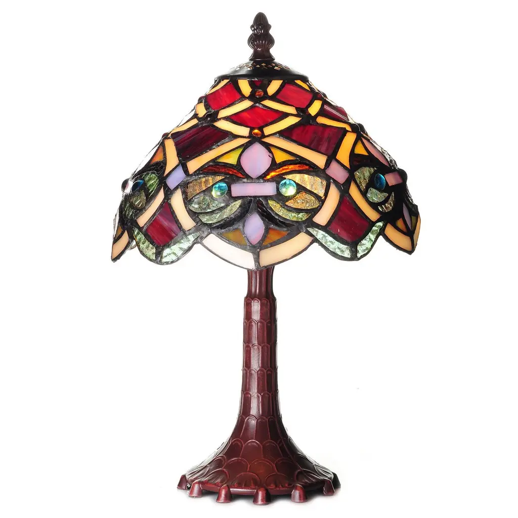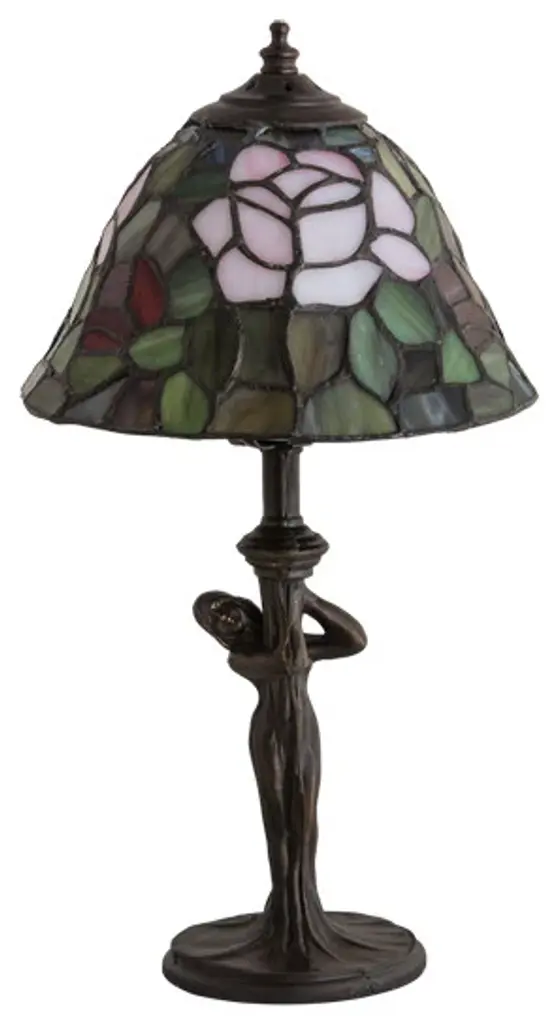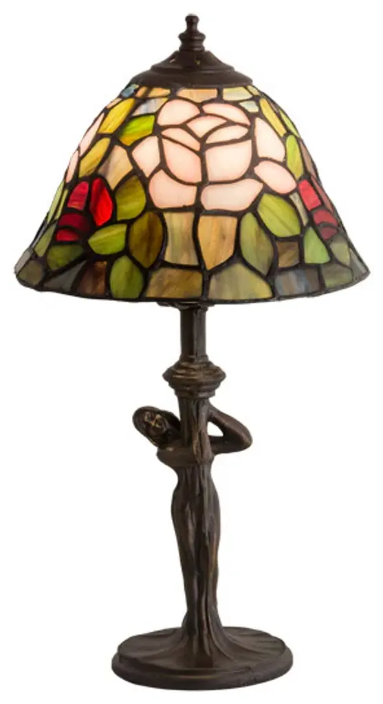 The most beloved of all flowers; the rose; is beautifully represented in this Meyda reproduction of a Tiffany Studio classic. Petal Pink; Romantic Red and Plum Passion art glass roses ramble on a maze of Garden Green leaves. The delicate domed stained glass shade is paired with a graceful; hand finished Mahogany Bronze mini lamp.