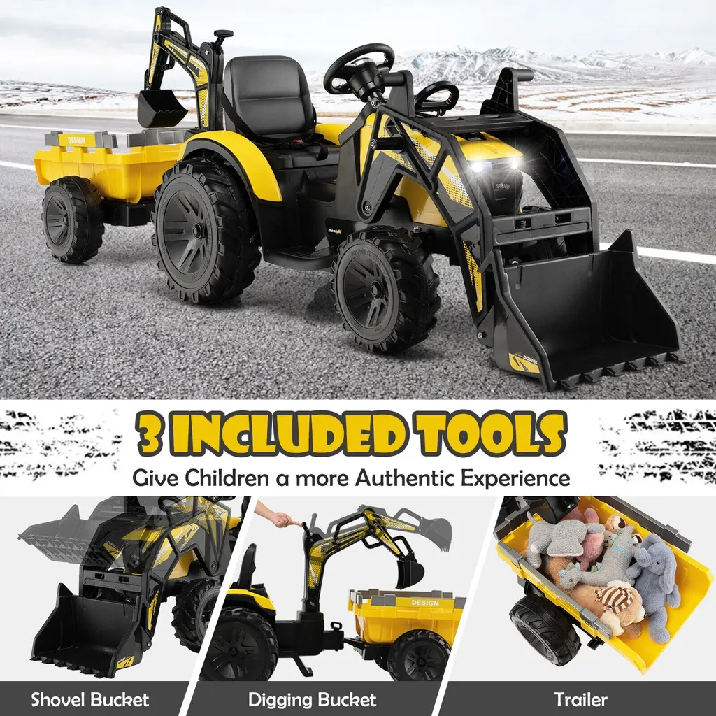 SpecificationsKey Features● 3 in 1 Electric Tractor: This electric construction vehicle comes with a shovel bucket, digging bucket and trailer. Parents can freely choose and install the desired parts to make a bulldozer, an excavator or a tractor, giving children a more authentic experience.● 2 Driving Modes with RC: Children can control this ride on tractor through the steering wheel and the accelerator pedal. Additionally, parents can operate the tractor with the 2.4G remote control that requires 2 x 1.5V AAA battery (not included). Parents can ride the kid around for interactions and safety.● Durable and Safety Designs: Equipped with 6 non-slip, shock-absorbing and wear-resistant wheels that are made of PP and EVA, this electric excavator with trailer is suitable for different flat roads, such as the asphalt road, brick road, boardwalk, etc. Also, the soft start function and seat with safety belt ensure great safe drive.● Music Function Adds more Fun: The multifunctional music player on the manual operating panel features the remaining power display, play/pause function, mode selection and volume adjustment. The USB port and MP3 socket allow children to enjoy their favorite songs or stories, and buttons on the steering wheel can make the music and horn.● Great Children Gift: This electric ride on excavator simulates a real construction vehicle, and its cool look will appeal to children. More than just playing, kids can use the trailer to help parents to transport fallen leaves or store their toys. They can improve their hands-on skills and develop good habits of tidying up items.Please Note: For more convenient shipment, the main body of the tractor and 3 included accessories will be packaged in 2 different boxes. And they may not arrive on the same day.