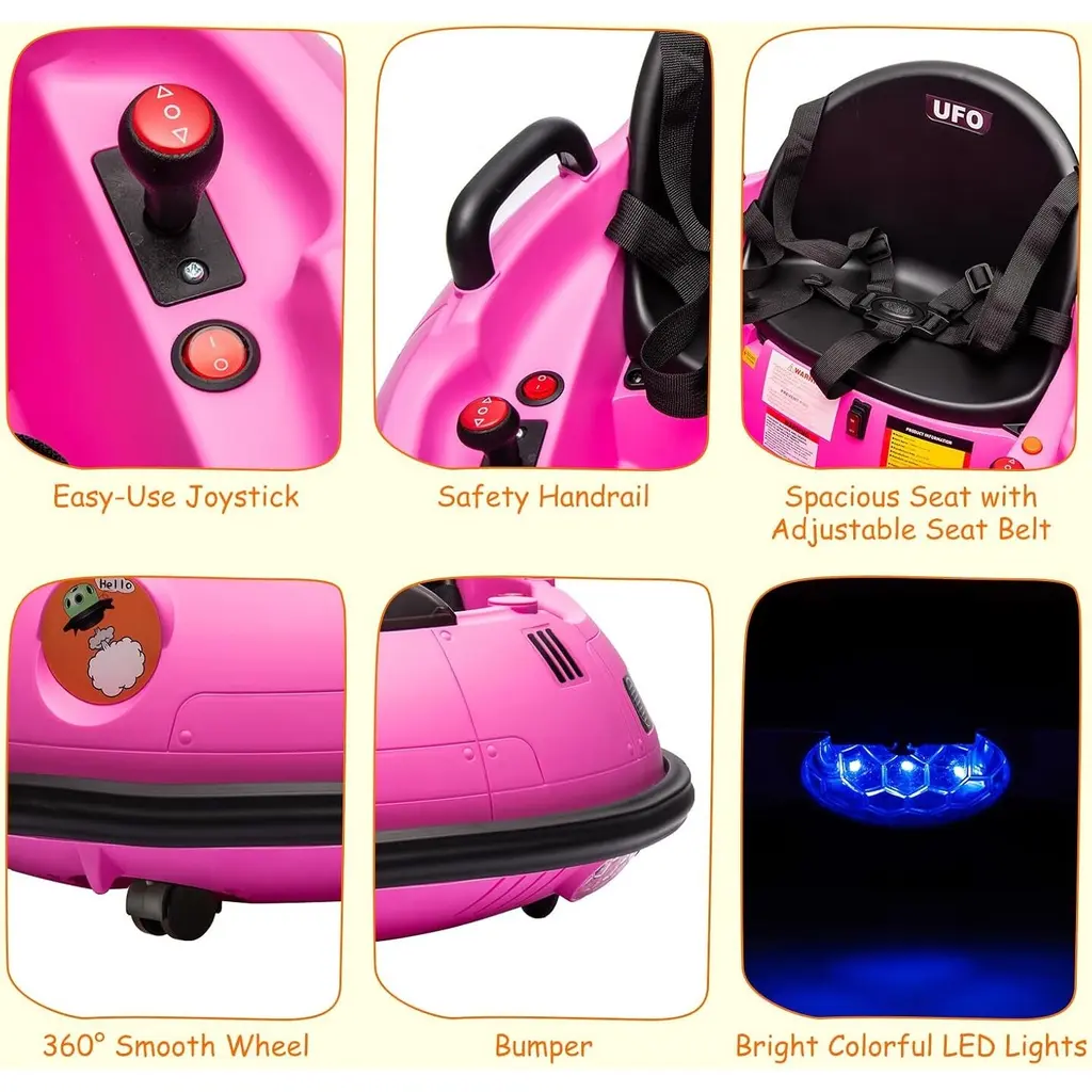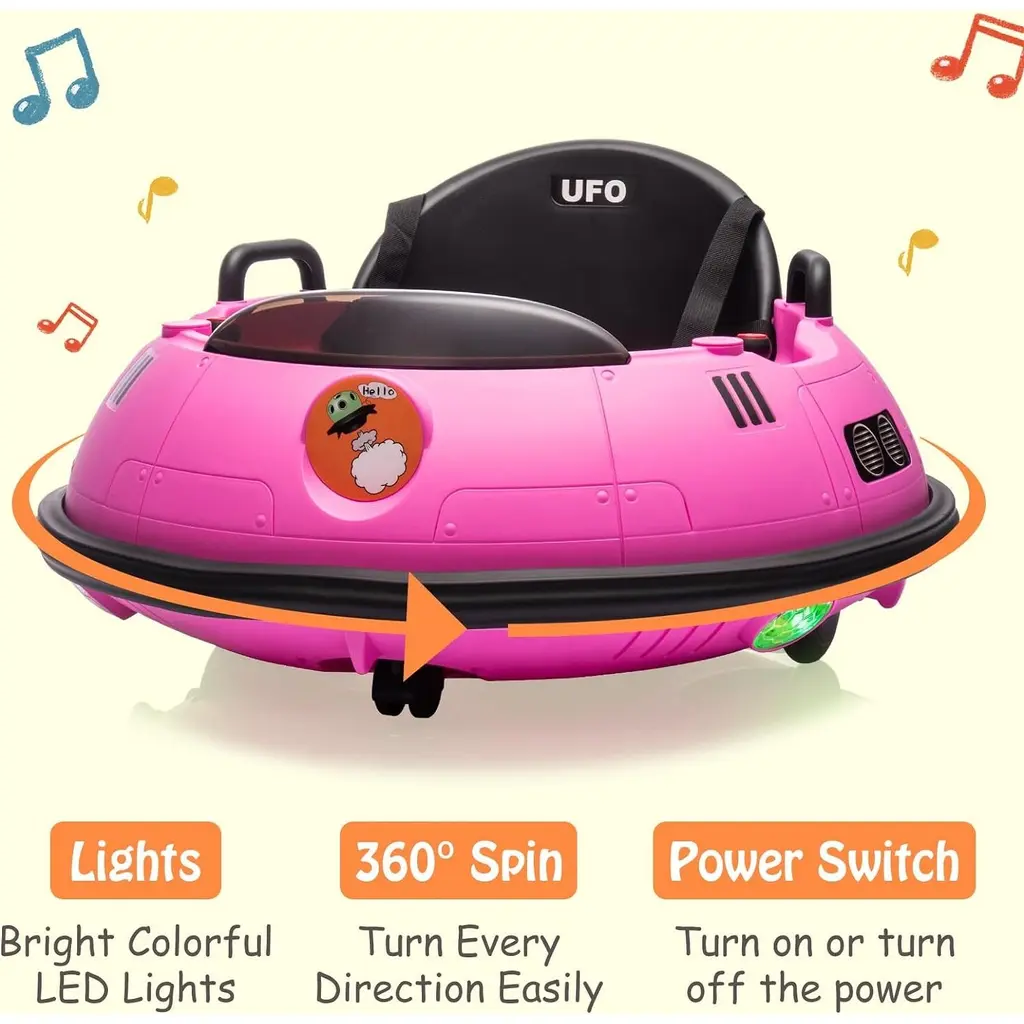 [360-Degree Spinning Wheels]This ride-on bumper car features versatile 360-degree spinning wheels that provide smooth movement and agile turns on a variety of surfaces. The slow start function enhances the driving experience, ensuring a comfortable and safe ride for children.[Fun Entertainment Features]Equipped with dynamic music and eye-catching LED lights, this bumper car adds an extra layer of excitement to playtime. The captivating flashing LED lights create a vibrant atmosphere, making riding even more enjoyable for kids.[Dual Operating Modes]With dual joysticks for intuitive control, the bumper car offers effortless maneuverability and the ability to spin a full 360 degrees. This design encourages the development of hand-eye coordination, foot coordination, and gross motor skills. Parents can use the 2.4G remote control to oversee play, ensuring safety and preventing misuse.[Safety-Focused Design]Built with soft anti-collision strips, this bumper car prioritizes children's safety by adding an extra layer of protection during collisions with walls or other vehicles.[Perfect Gift for Kids]An excellent present for both boys and girls, this electric bumper car provides a unique and thrilling ride experience, bringing joy and laughter to children's playtime adventures.