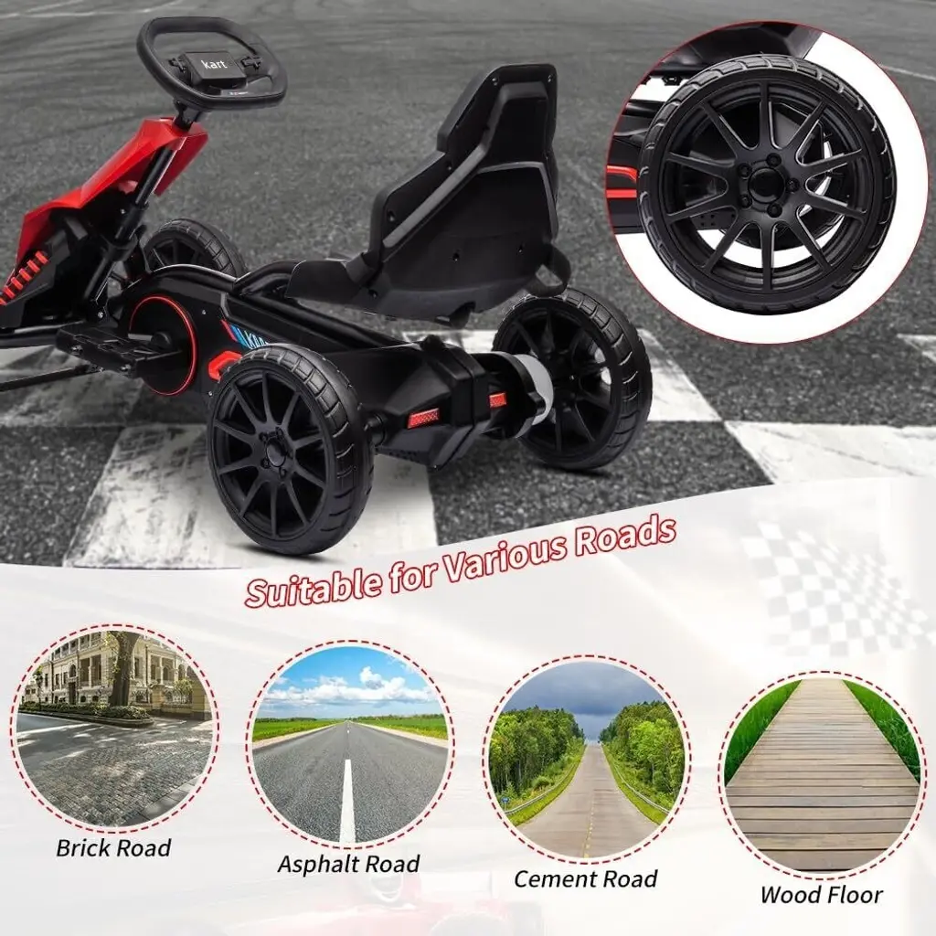 Powerful Electric Go-Kart:This kids' electric go-kart is powered by a robust 12V 7Ah rechargeable battery, providing 1-2 hours of driving time on a full charge, depending on weight and terrain. It features two speed settings (1.55-2.8 mph) to cater to different driver skill levels. Safety-First Design:Designed for single-driver use, this go-kart supports a maximum weight of 66 pounds. It includes a safety belt to ensure that your child enjoys their ride while maintaining safety as a top priority. Realistic Drifting Experience:With a convenient one-button start function, this electric go-kart delivers an authentic driving experience. Featuring an accelerator pedal and steering wheel, kids can easily switch between normal driving and drift modes for an exhilarating ride. Durable EVA Wheels:Equipped with durable EVA wheels, this toy car ensures improved braking, reduced wear and tear, and enhanced stability. These wheels are perfect for various outdoor terrains, making it suitable for all kinds of adventures. Perfect Gift for Young Drivers:This racing pedal kart provides an exciting and cool driving experience for kids, with plenty of playtime available on a full charge. It's an ideal gift for birthday celebrations, bringing joy and entertainment to young drivers.