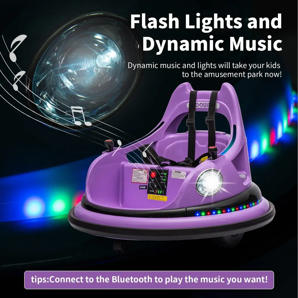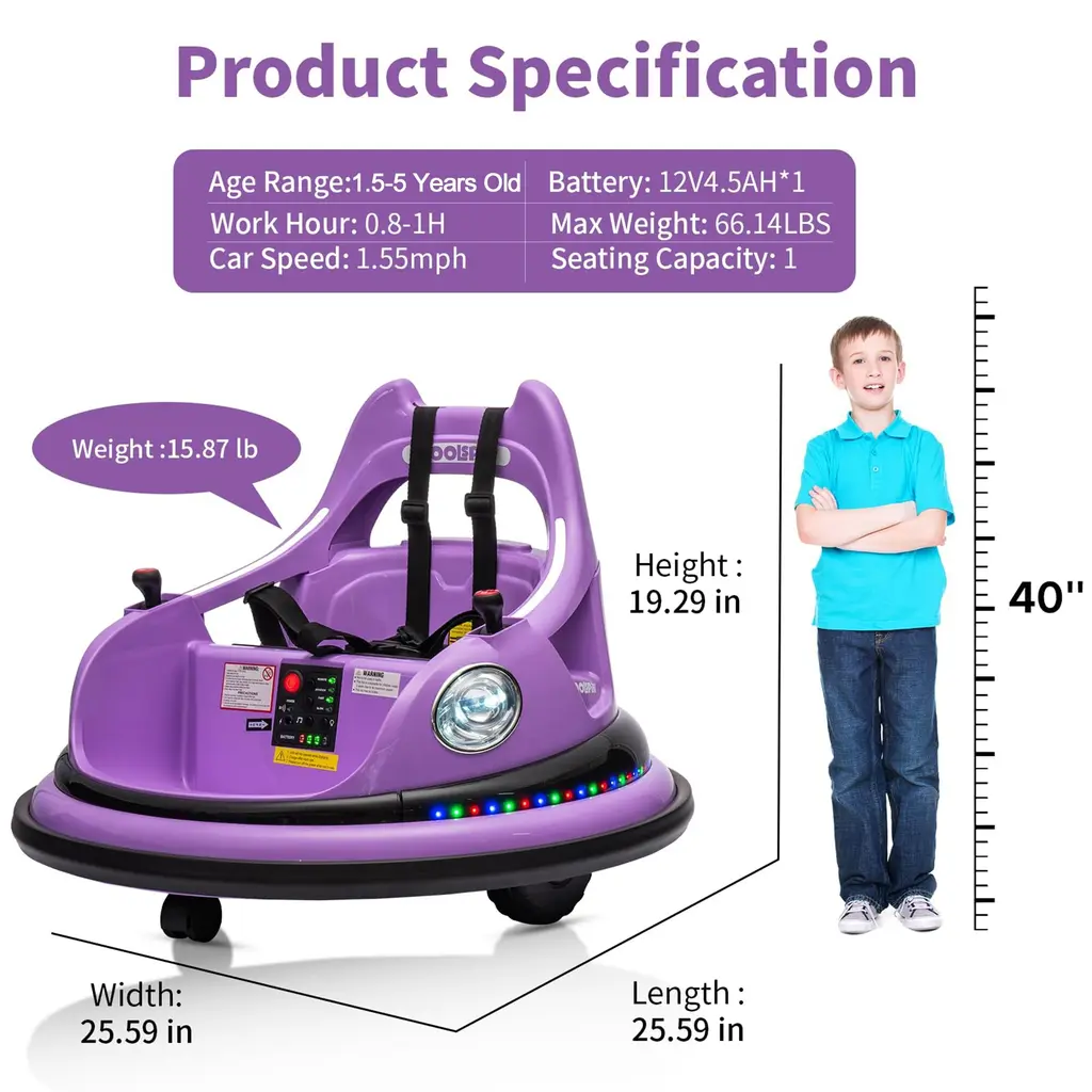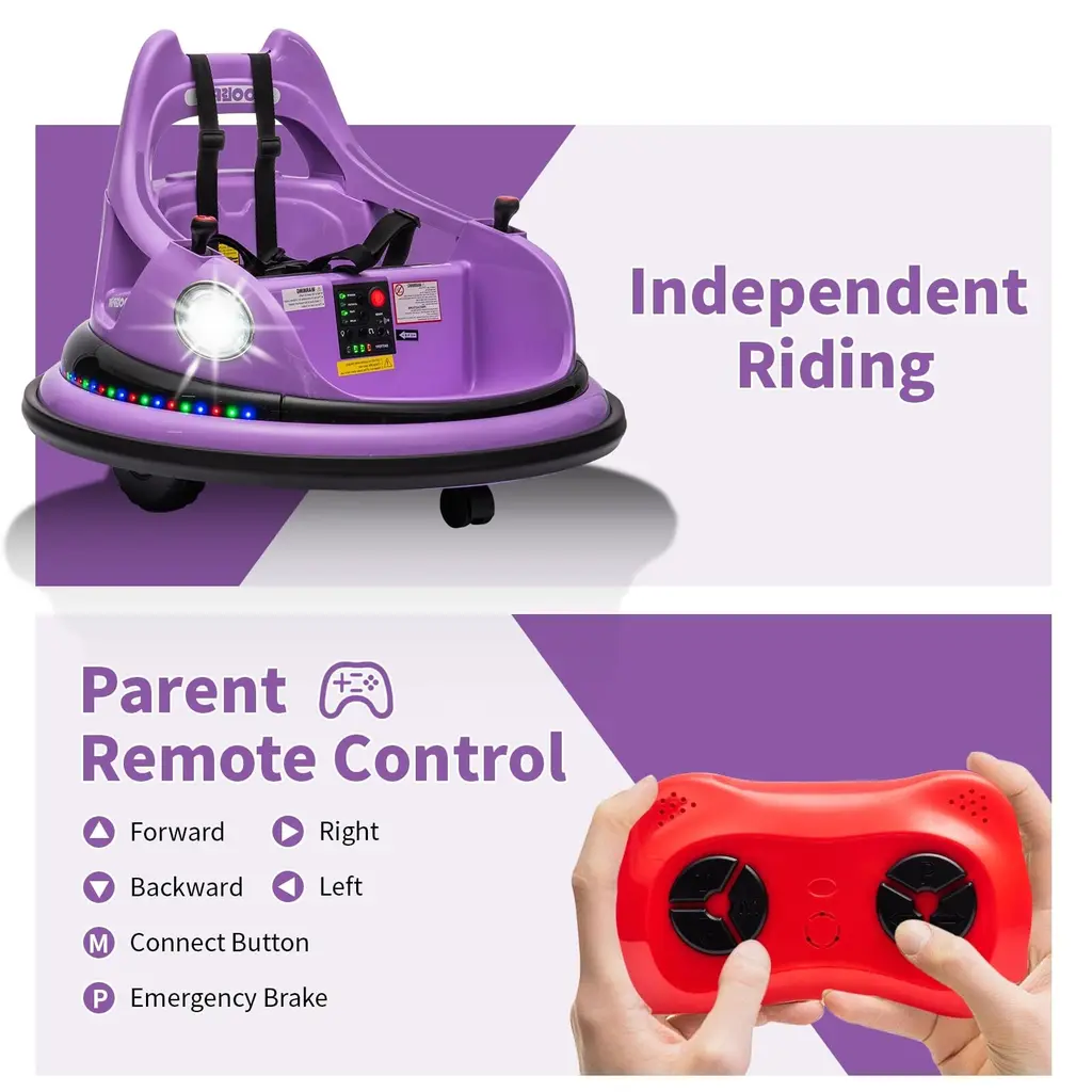 12v Electric Kids Bumper Car W/ Parent Remote Control, Led Lights, Bluetooth Music & Anti-Collision Padding (Ages 1.5-5 Years) - Purple