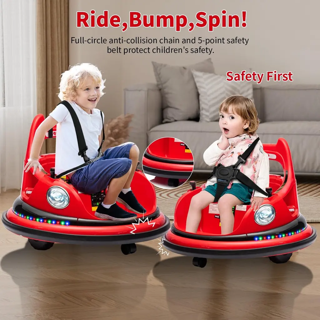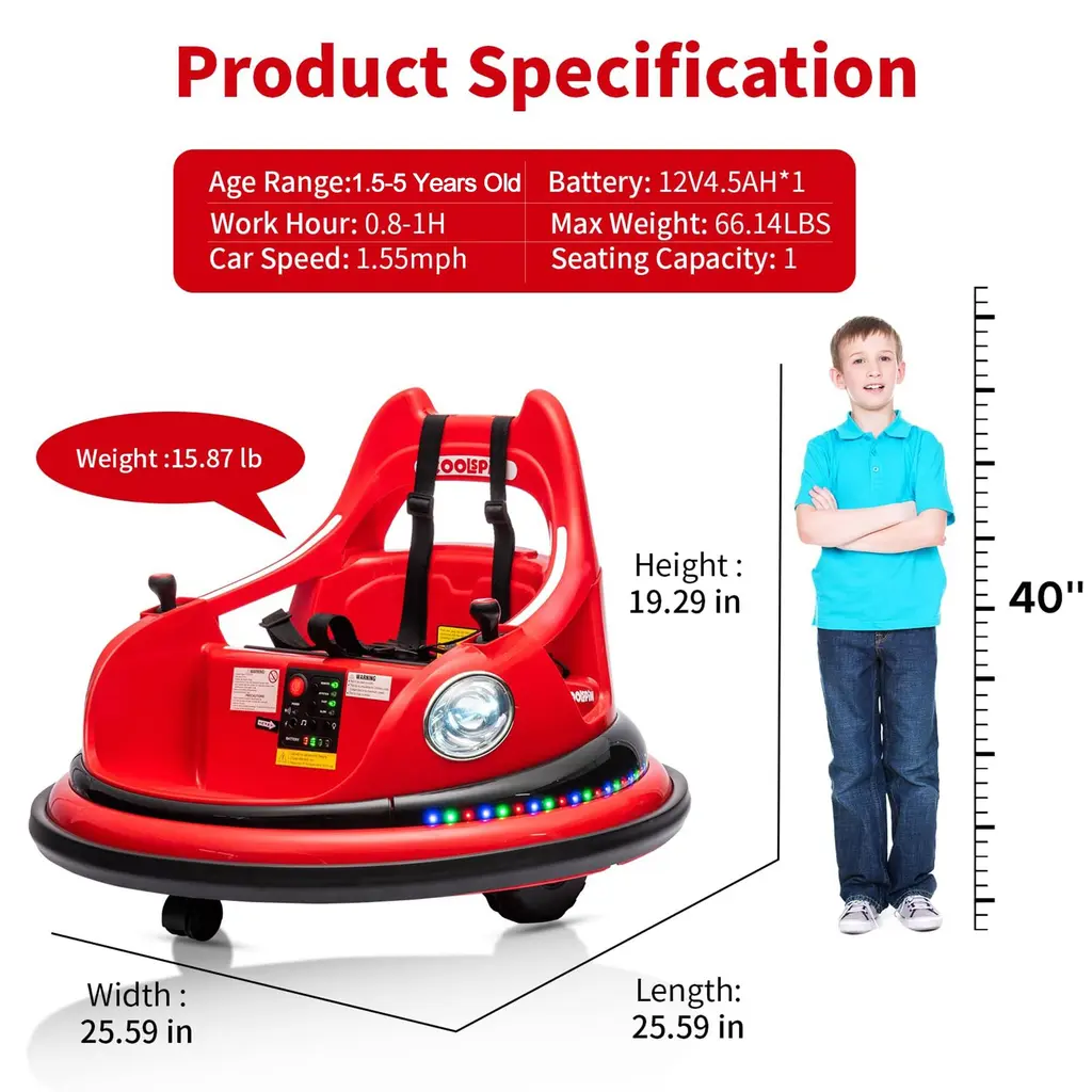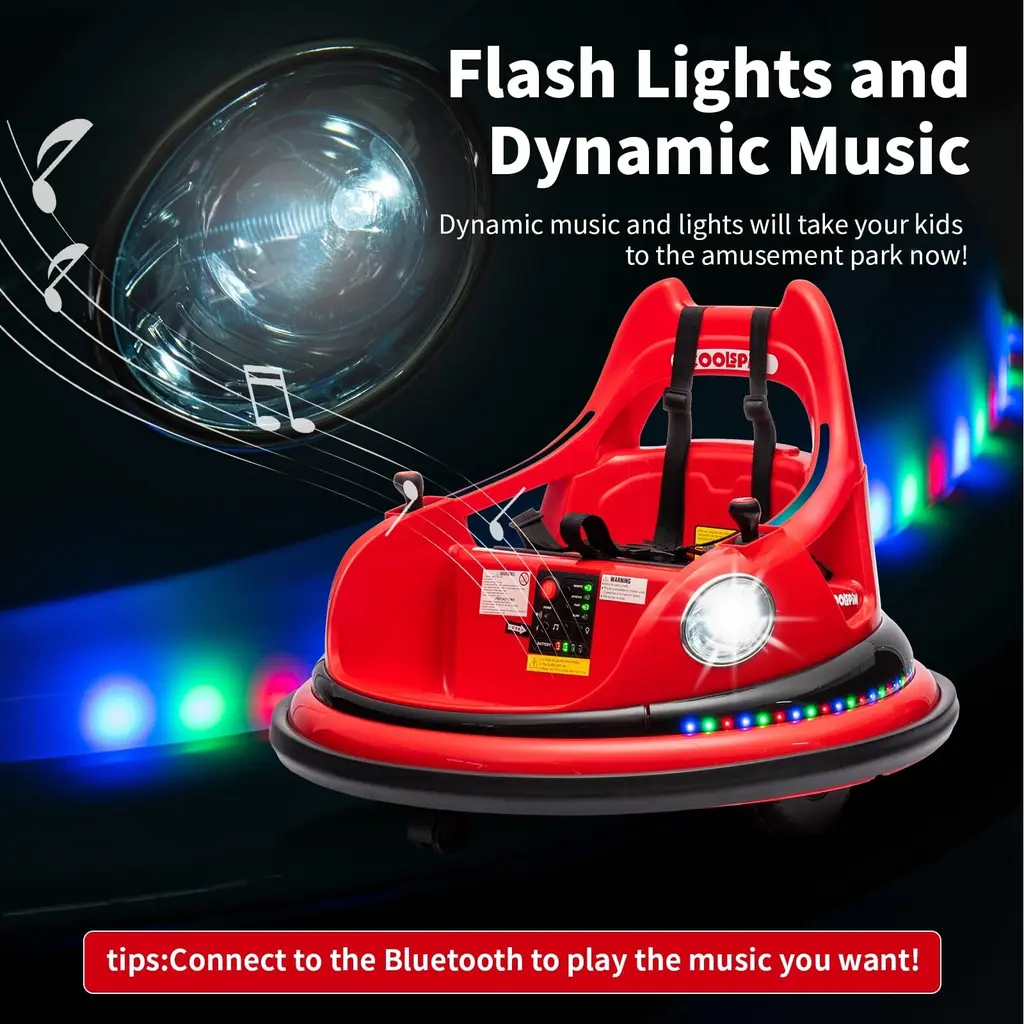 Features:【2.4G Remote Control Function】- Easily navigate the toy with a 2.4G remote control system. Parents can safely control and enjoy the bumper car experience remotely.【Bilateral Sequential Flashing Lights with Front LED Lights】 -Experience dynamic lighting effects with sequential flashing lights on both sides and prominent front LED lights.【Full-Circle Collision Protection Strips on the Body】- Equipped with protective strips surrounding the body for added safety.【Dual Handle Switches for Directional Control, 360° Rotation】- Conveniently control the toy's movement with handles on both sides, allowing for a full 360° rotation.【Dual-Drive System with Front and Rear Omni-directional Wheels】- Ensure smooth movement with a dual-drive system and omni-directional wheels.【Integrated Center Console under the Seat】- Enjoy centralized control with one-touch start, music, lights, Bluetooth, battery level display, high/low-speed settings, and a charging function.【Five-Point Safety Harness】- Prioritize safety with a reliable five-point safety harness.【1 Hour of Playtime】- Extend the fun with up to 1 hour of playtime on a single charge.【ASTM CPC Safety and Environmental Certification】- Complies with ASTM CPC safety and environmental standards, ensuring a certified Specification:Function:Product Dimensions