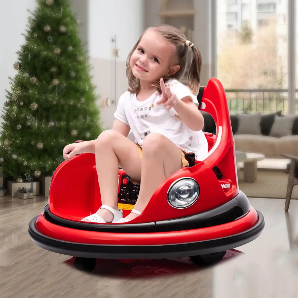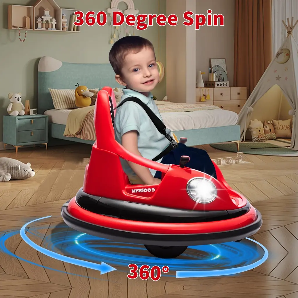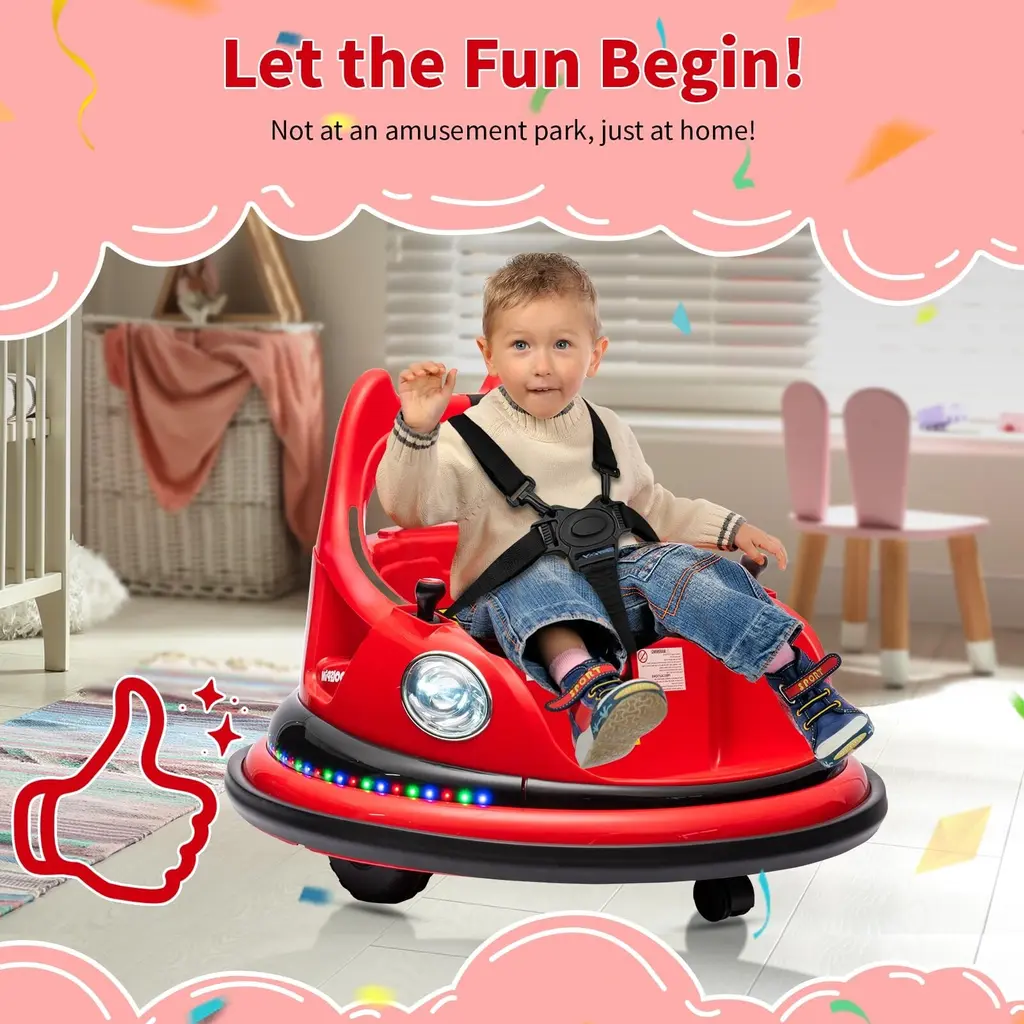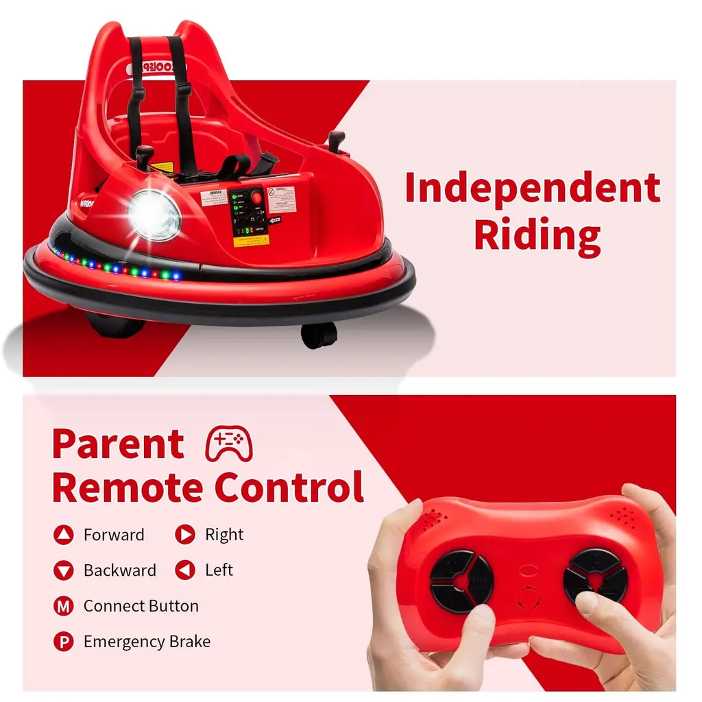 Features:【2.4G Remote Control Function】- Easily navigate the toy with a 2.4G remote control system. Parents can safely control and enjoy the bumper car experience remotely.【Bilateral Sequential Flashing Lights with Front LED Lights】 -Experience dynamic lighting effects with sequential flashing lights on both sides and prominent front LED lights.【Full-Circle Collision Protection Strips on the Body】- Equipped with protective strips surrounding the body for added safety.【Dual Handle Switches for Directional Control, 360° Rotation】- Conveniently control the toy's movement with handles on both sides, allowing for a full 360° rotation.【Dual-Drive System with Front and Rear Omni-directional Wheels】- Ensure smooth movement with a dual-drive system and omni-directional wheels.【Integrated Center Console under the Seat】- Enjoy centralized control with one-touch start, music, lights, Bluetooth, battery level display, high/low-speed settings, and a charging function.【Five-Point Safety Harness】- Prioritize safety with a reliable five-point safety harness.【1 Hour of Playtime】- Extend the fun with up to 1 hour of playtime on a single charge.【ASTM CPC Safety and Environmental Certification】- Complies with ASTM CPC safety and environmental standards, ensuring a certified Specification:Function:Product Dimensions