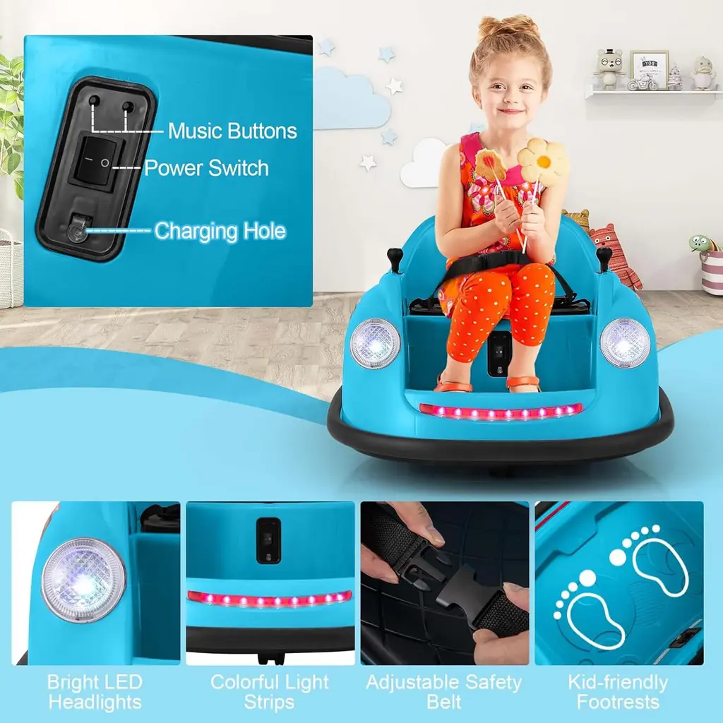 Drive into a world of fun with our 12V electric ride on bumper car! Equipped with 12V powerful dual motors, this electric bumper car provides a reliable performance. The 12V 4.5AH rechargeable battery offers extended playtime, boasting easy charging with the convenient charger and port. Parents can control the bumping toy with the remote for younger kids, while older ones can drive themselves using the joysticks. With the ability to spin 360° on 2 universal wheels and soft bumpers for safety, this ride-on toy promises a thrilling and secure ride. Additionally, the bright LED lights and playful music add to the excitement of every adventure. Designed for children aged 2 to 5 years, this baby bumping toy makes for a perfect gift that will bring joy and learning together. Features:Specification