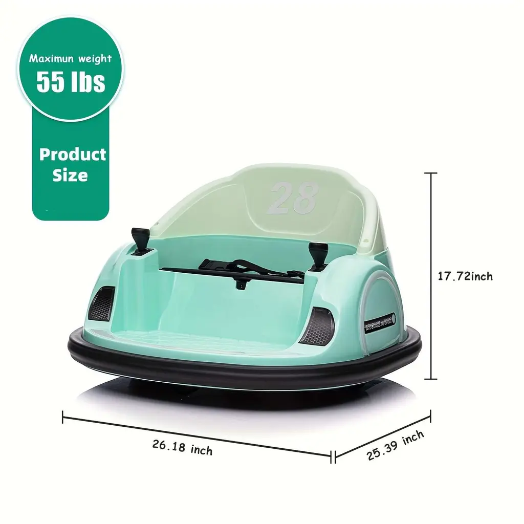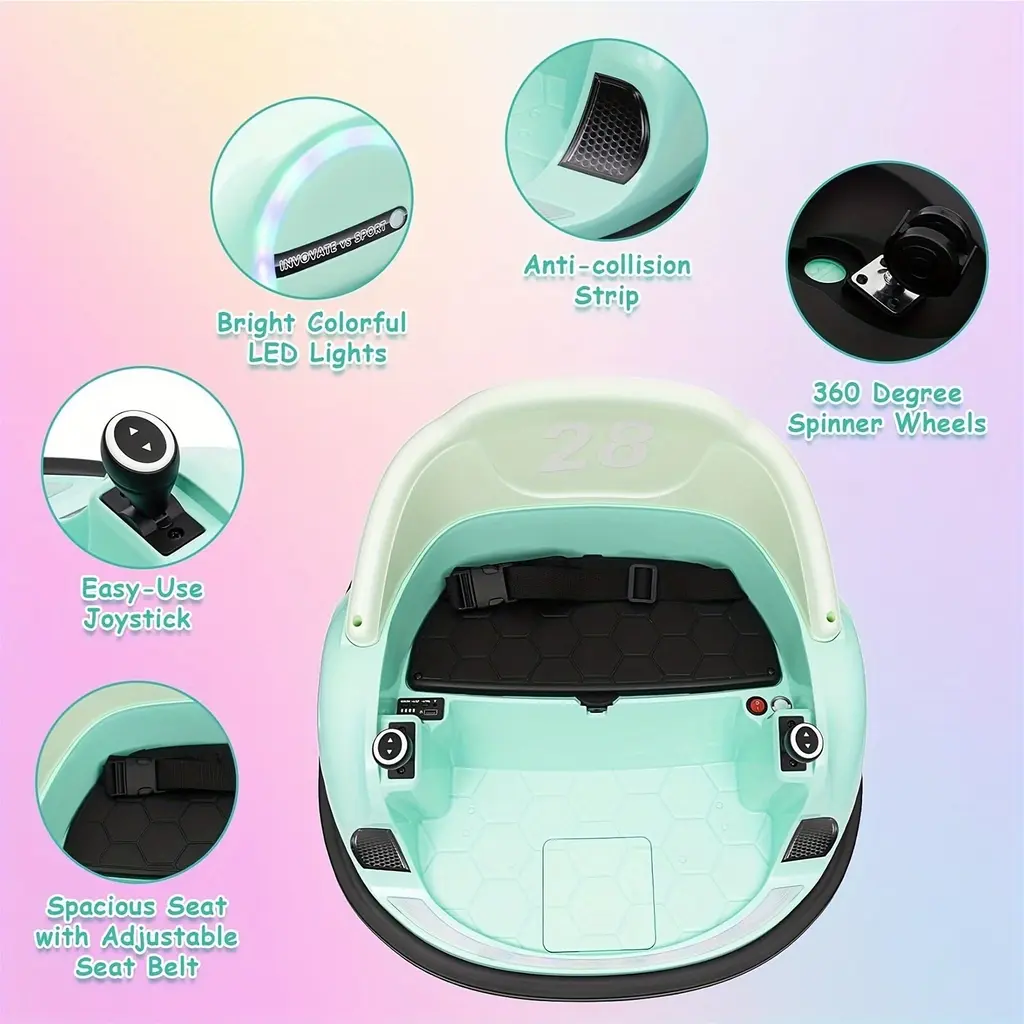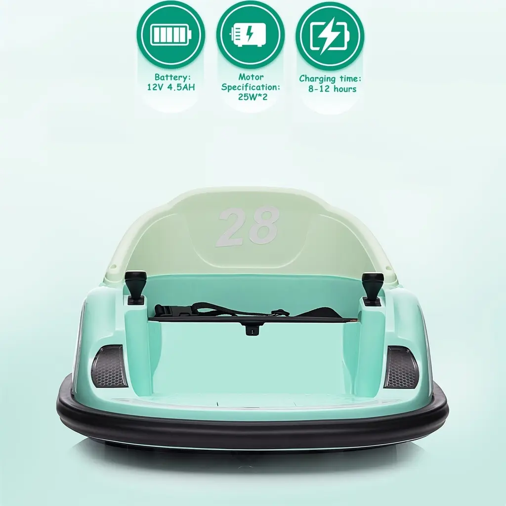 Enhanced Performance: The kids bumper car is powered by a long-lasting 12V rechargeable battery, ensuring extended playtime. Equipped with 25W*2 powerful motors, children can drive comfortably on various terrains, experiencing premium performance with every journey.360-Degree Spin Wheels: Featuring 2 directional wheels and 2 360-degree spin wheels, this ride-on bumper car offers smooth movement and flexible turns on different road surfaces, enhancing the overall driving experience for children.Driving Modes & Parental Control: The electric bumper car provides easy control and maneuverability with dual joysticks, allowing kids to drive independently and enjoy the thrill of driving. Parents can also utilize the 2.4G remote control to control forward, backward, steering, and speed functions, ensuring the safety of children during play.Entertaining Features: The toddler toy car includes colorful LED lights, dynamic music, and engaging stories to create a fun and entertaining experience for children. Additional features such as the USB port and battery indicator add convenience to the ride.Safe and Durable Design: Designed with soft anti-collision strips, the battery-powered bumper car is crafted from durable materials that meet rigorous child safety standards, ensuring reliability and safety during playtime. This ride-on toy offers a unique ride experience, making it the perfect gift for both boys and girls seeking an exciting playtime adventure.