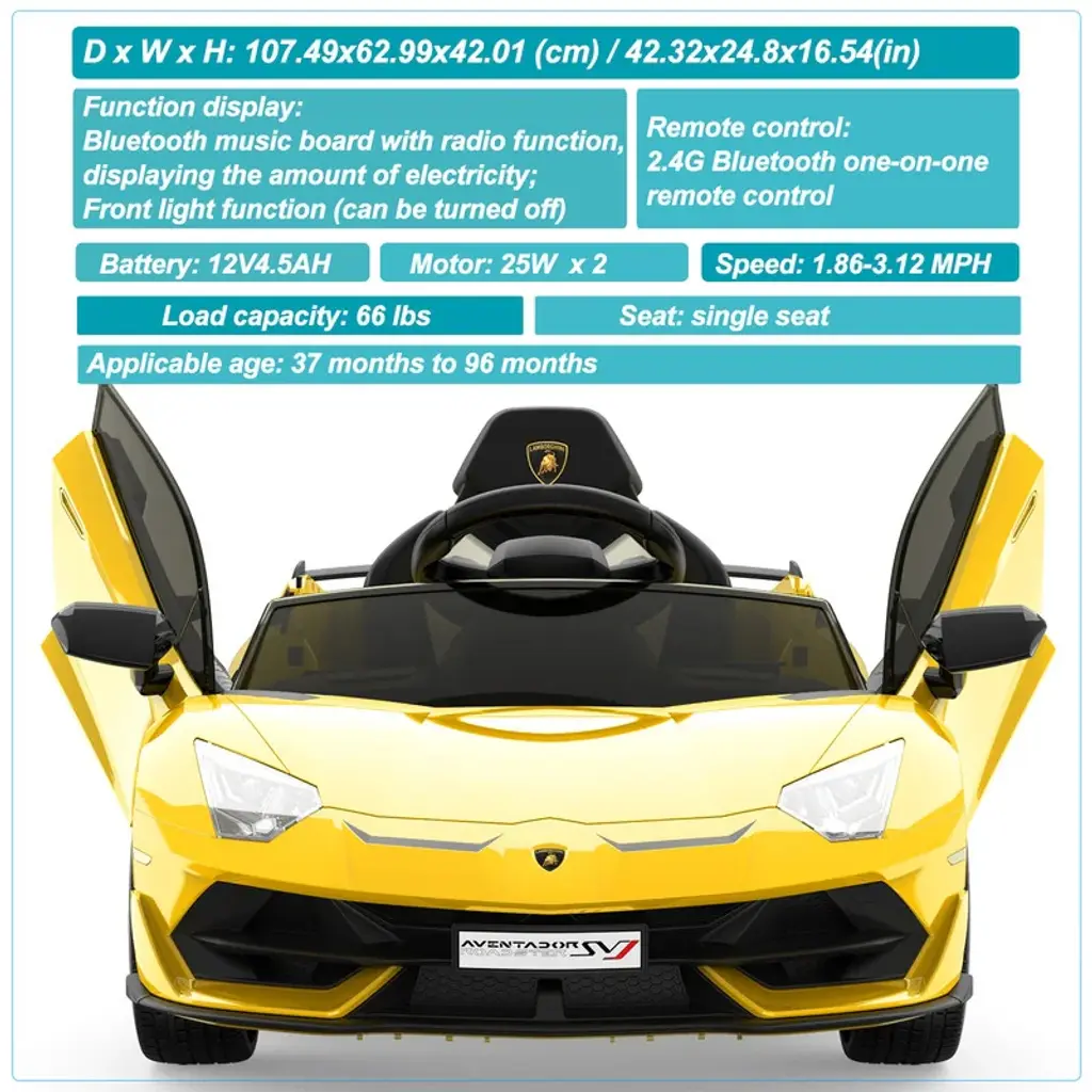 Licensed Lamborghini DesignLED headlights, realistic horn and engine sounds, hydraulic-powered doorsBattery charging time: 8-12 hoursTwo Driving ModesParental remote control with three speed settingsKid’s manual operation with two speed settingsEngaging Lights and SoundsBuilt-in music and story featuresConnects via Bluetooth, AUX cord, TF port, or USB portLED front and rear lightsPowered by two 25W motors and 12V rechargeable batteriesRide duration: 1-2 hoursSpeed range: 1.86 to 3.12 mphThe Perfect Gift for KidsMade from safe materialsEnhances playtime and parent-child interactionCertified with ASTM and CPSIAIdeal for birthdays or Christmas