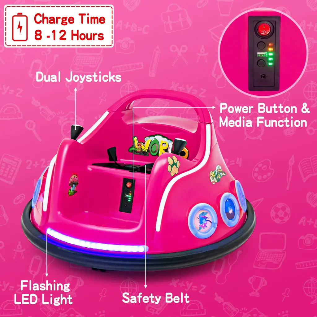 Specifications:Description:● 360-Degree Spin: This 12v electric bumper car features a 360-degree rotation design that allows your child to drive in all directions for more fun. Besides, it features remote control 3-speed regulation with a maximum speed of 1.25 mph, and kids can operate the bumper car with the dual joysticks.● Exciting Lights and Charming Design: Coming with the front LED light and side breathing lights, this bumper car immerses your child in a world of excitement and wonder. Moreover, with its charming cartoon pattern design, this bumper car adds an extra touch of delight to playtime. ● Safe and Durable Use: This bumper car has ASTM, CPSIA certificate and features a safety belt to ensure a secure ride. The soft bumper and pre-charge design enable children to play safely. Plus, with the convenient remote control design, parents can control this ride on car outside to ensure safety.● Built-in Music and Wireless Connection: Let the rhythm guide their excitement! This bumper car comes with a built-in music system and wireless connection, allowing your child to enjoy their favorite tunes while driving around. They can create their own soundtrack as they embark on thrilling adventures with the bumper car.● Perfect Gift for Kids: With its thrilling 360-degree spin, exciting lights and sounds, charming design and 12V powerful motor, this bumper car is the perfect gift to bring joy and excitement to any child's life. Whether it's for birthdays, holidays, or any special occasion, this bumper car will provide endless fun and adventure.