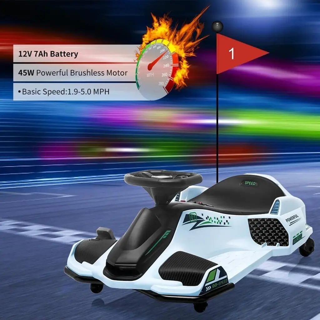 [Easy to Control Drift] The drift system allows driver keeps both hands on the steering wheel all the time,controlling the drift through a balance of throttle control. [Drift Racing Excitement] This 12V drift car features variable speed foot pedal acceleration,7Ah battery and 45W powerful motor.Low speed:1.9-5mph,High speed:4.9-7.5mph. [High Quality & Stable] The drift car has high quality metal frame,with rechargeable battery system and bushless motor. 5.5" front tire and two anti-tip front auxiliary wheels. [Much More Fun for Kids] The cart equiped with one-button start funtion, power display and low-power alarm can let you know it's time to charge.Also equiped with music,Front+Tail lights and a flag to provide more funny for kids. [Great Option for Kids] The drift go cart's overall size:35.43"L*20.86"W*13.18"H, Max weight load: 110lbs . Recommended Age: 8 and up. Certified by ASTM,CPC, safety for children.