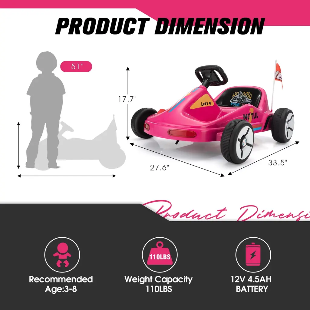 Product Overview:Give your child the thrill of racing with the 12V Kids Ride-On Go Kart. This electric 4-wheeler car is designed for children aged 3-8 years, offering both fun and safety. With a cushioned seat, LED lights, MP3 music, Bluetooth connectivity, and a parental remote control, this go-kart combines exciting play with peace of mind. The sturdy build and adjustable speed settings make it an ideal choice for young racers looking for their first driving experience.Product Features:Specifications:Suitable Scenarios:Perfect for use on flat surfaces such as driveways, sidewalks, and backyards, this electric go-kart is ideal for children who love outdoor adventures and thrilling rides.Notes:Ensure the battery is fully charged before use for optimal performance. Always supervise children during play and follow the safety guidelines as outlined in the user manual. Assembly by an adult is required.