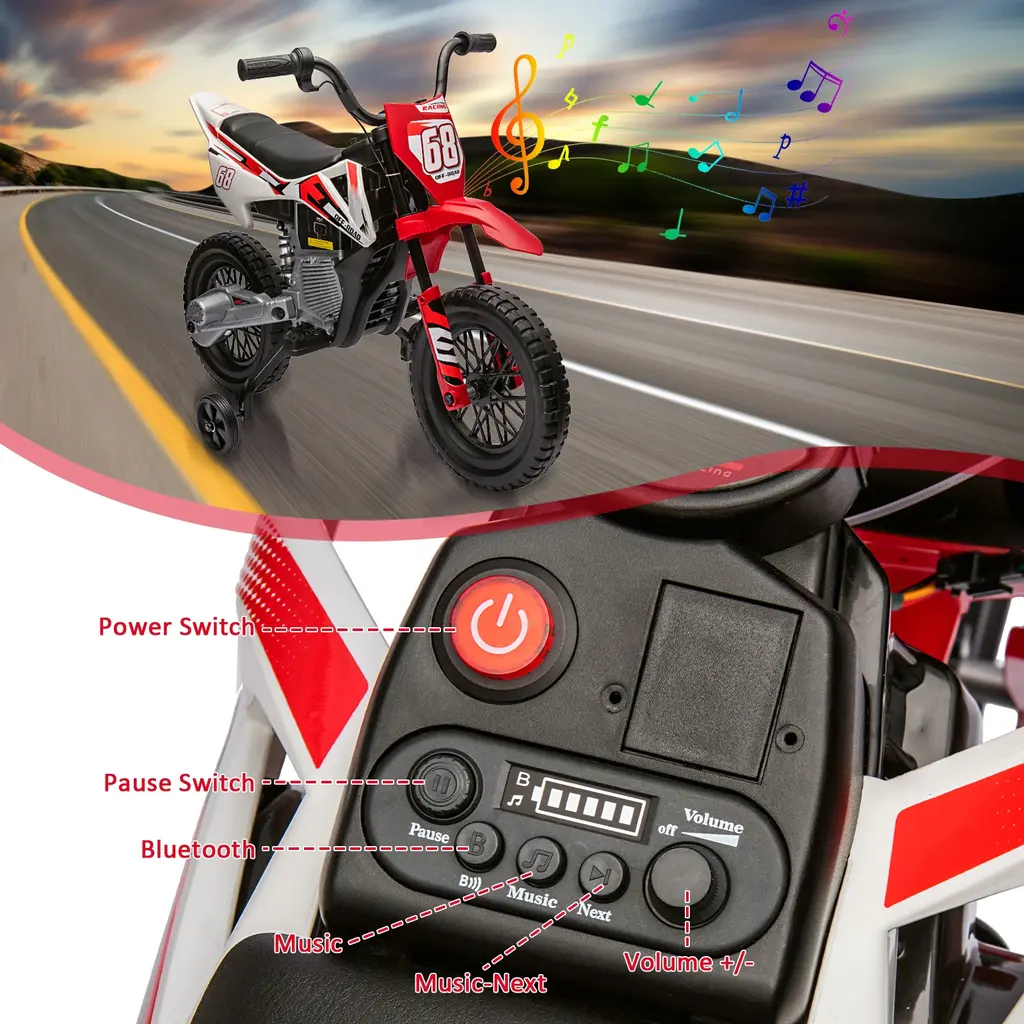 12V Kids Dirt Bike Ride on ToyEquipped with training wheels, spring suspension, powerful 25W x 2 motors, high/low speed available, and built-in music and USB entertainment functions, our 12V battery-powered ride-on motorcycle will give kids a safe and enjoyable adventure, the perfect gift for a child's birthday or Christmas.SPECIFICATIONS:Product Type: Electric Motorcycle Dirt Bike for KidsPower: 12V Battery-PoweredFeatures: Off-Road Street Bike Design, Training Wheels, Spring Suspension, High/Low SpeedsMotor: 25W x 2Speed: 1.8-3.2mph(3-5km/h)Dimensions: Overall - 42.52"L x 17.71" W x 25.59" HWeight Capacity: Maximum 66 lbs(30kg)Entertainment: Built-in Music, USB, and Bluetooth FunctionalityIdeal for: Children's Birthday,or Special OccasionsPACKAGE CONTENT:1 x Electric Motorcycle1 x Motorcycle Keys1 x Installation Manual1 x Setup Toolkit