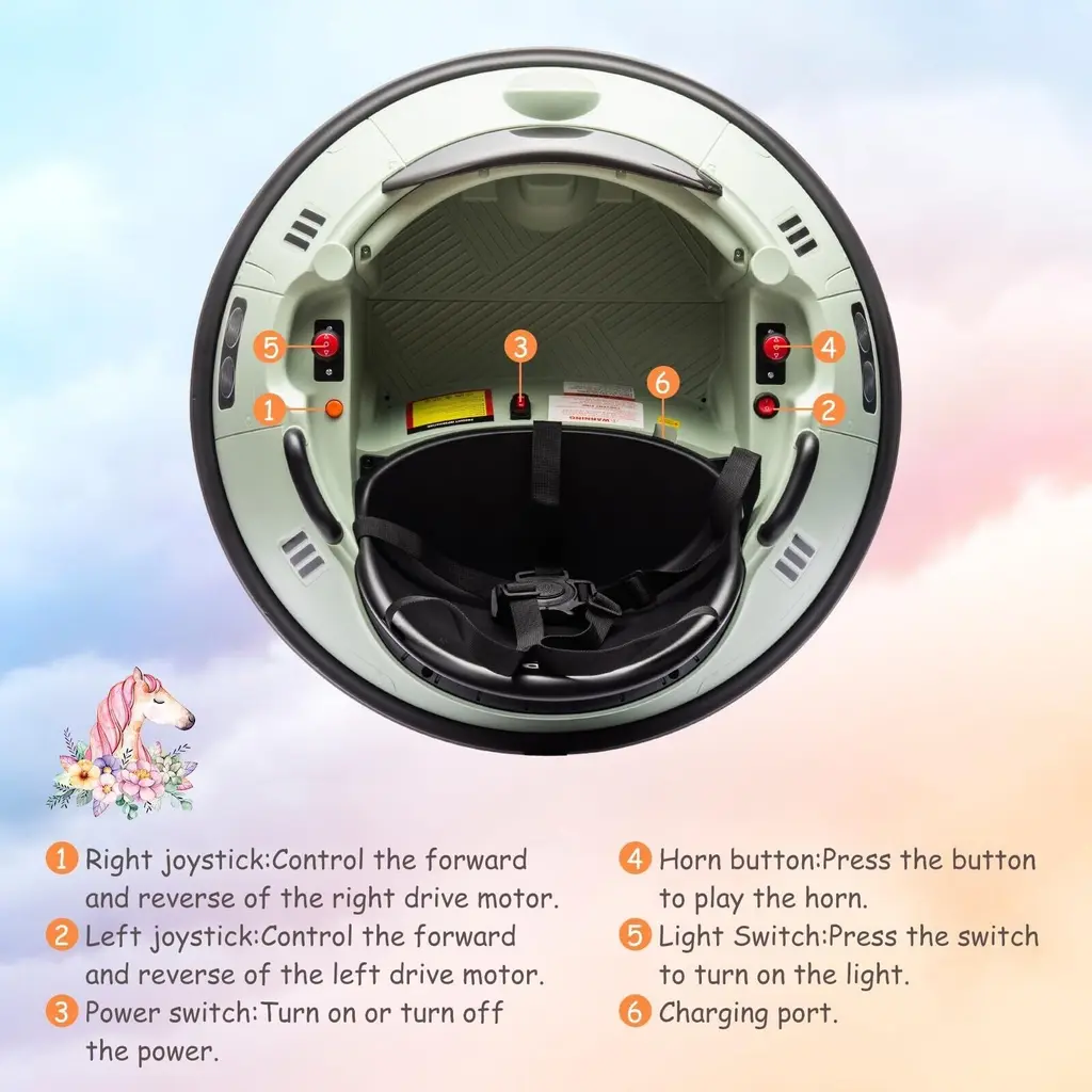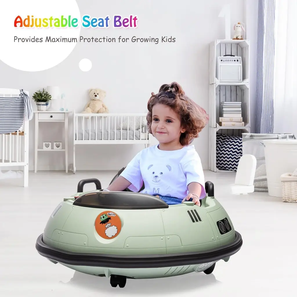 Advanced Motor Power: The Kids Bumper Car is driven by a 12V battery and features a powerful motor (25Wx2) that ensures a comfortable driving experience across various terrains. Safety-First Bumper Design: Certified safe through rigorous testing, the bumper car is fitted with soft anti-collision strips to safeguard children from injuries. An ergonomic backrest, seat, adjustable safety belt, and anti-slip footrest work together to provide a secure and comfortable driving environment. Enhanced Maneuverability: Equipped with 360° degree spin wheels and a Slow Start Function for seamless operation, the ride-on bumper car boasts 2 directional wheels and 2 swivel wheels for smooth movements and flexible turns on different surfaces. Dual Control Options: Children can operate the bumper car using dual joysticks, fostering hand-eye coordination and boosting gross motor skills. Additionally, parents can utilize the 2.4G remote control feature for increased safety and supervision. Endless Entertainment and Physical Development: Featuring sturdy construction and an appealing design, this ride-on bumper car offers limitless fun for kids. It aids in strengthening endurance, coordination, and motor skills, providing outdoor entertainment that promotes overall growth and development.