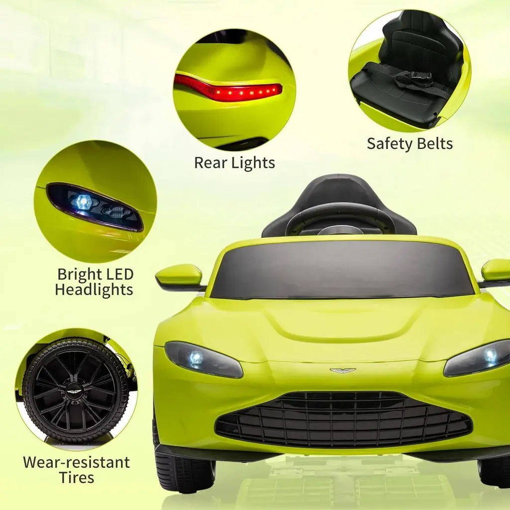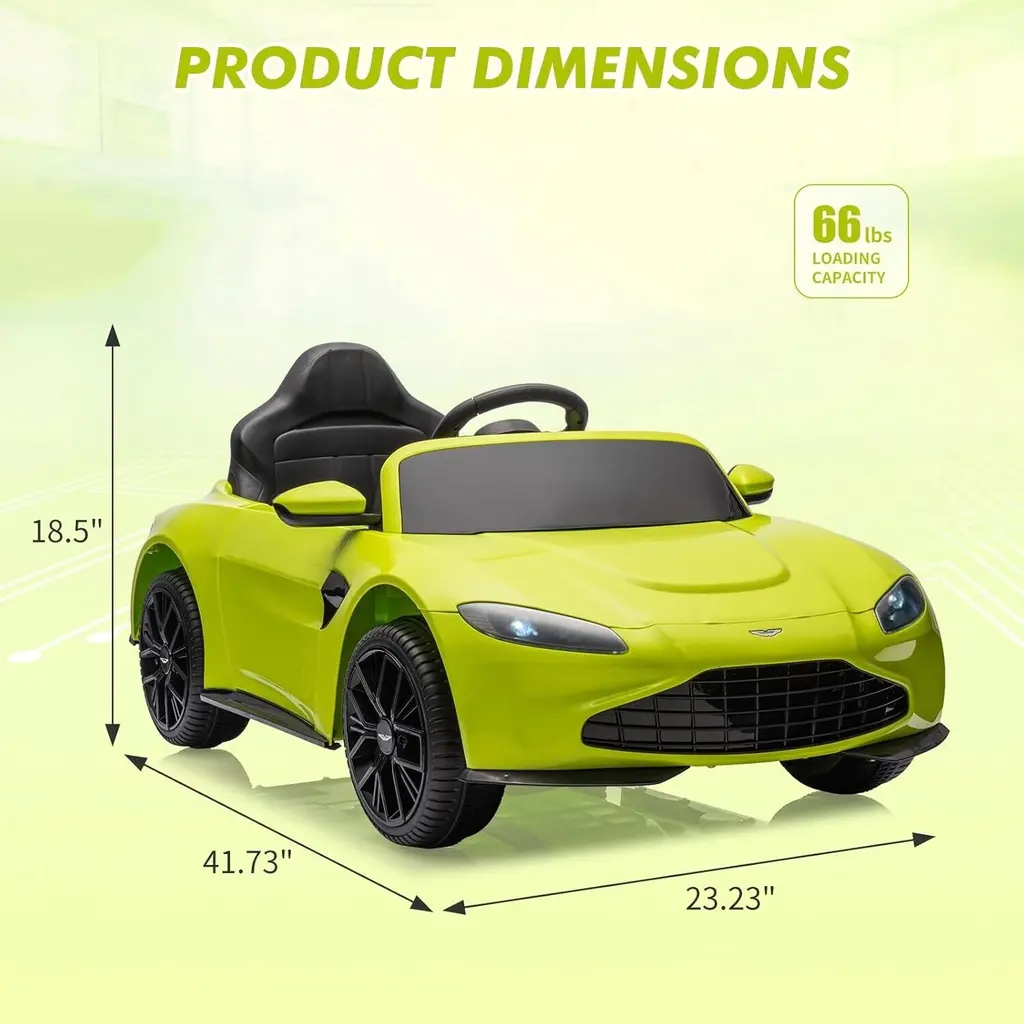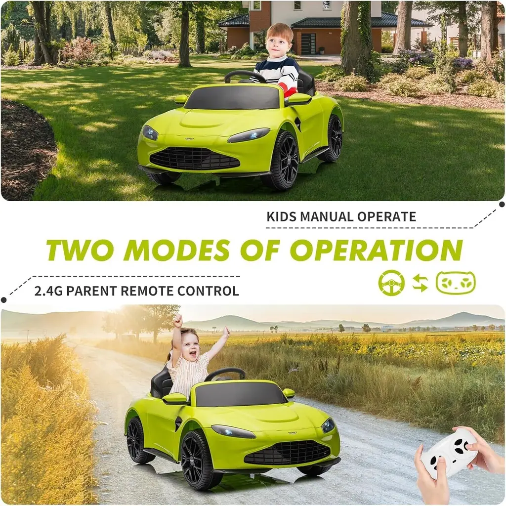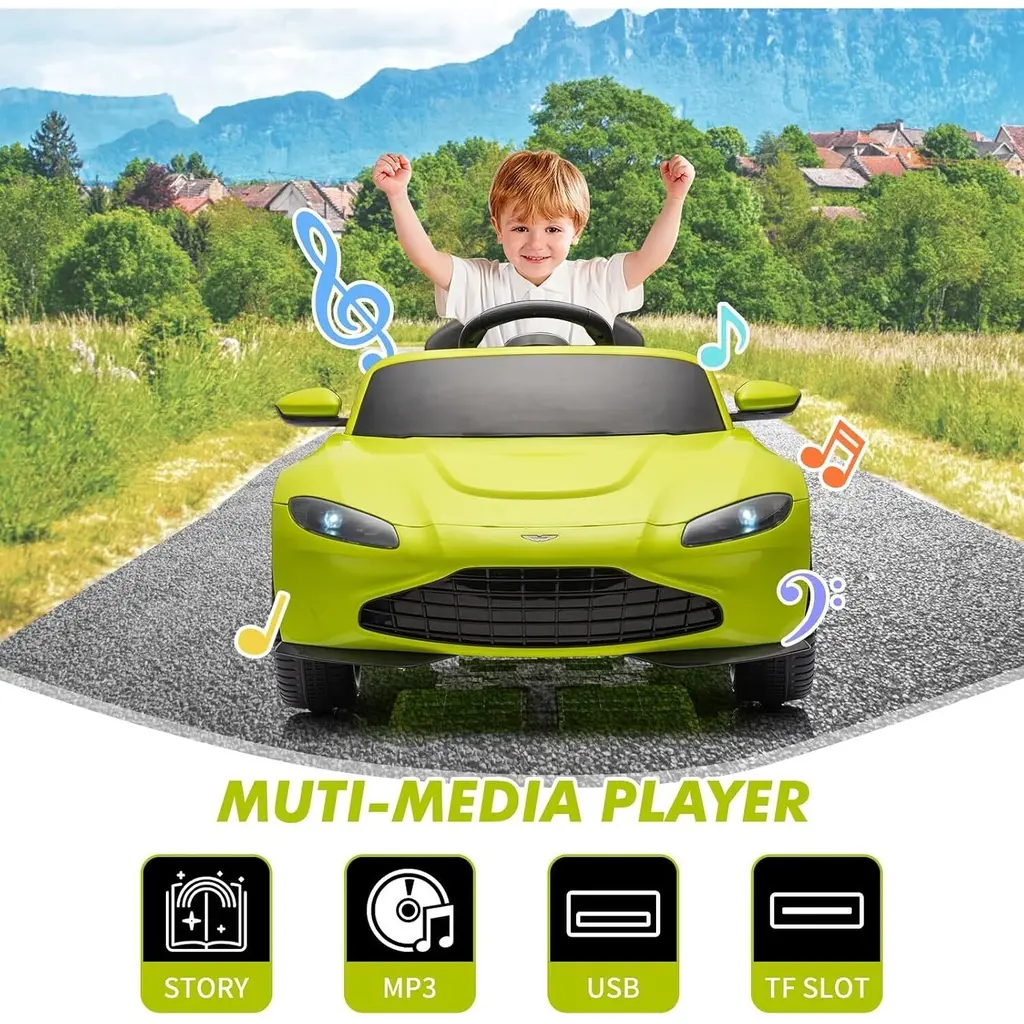 Licensed Aston Martin Design: Officially licensed Aston Martin car for kids aged 36-95 months. Features double openable doors, LED headlights, and rear lights for a realistic driving experience, this battery powered sports car is suitable for young car enthusiasts. High Performance: Featuring a 12V 4.5AH battery and dual powerful motors, this 2WD ride-on car delivers seamless rides on various terrains. With a weight capacity of up to 66lbs, young adventurers can enjoy extended playtime without compromise. Safety First: With wear-resistant tires, adjustable safety belts, and a gradual start function to prevent sudden acceleration, this sports car places a strong emphasis on safety. The inclusion of a spring shock absorption system provides a smooth and secure ride, offering peace of mind for parents and a comfortable experience for young drivers. 2 Driving Modes: The steering wheel and control panel provide a realistic driving experience, and the electric foot pedal ensures easy and intuitive control. While Parents can supervise using the remote control mode. This kids electric vehicle offers an engaging driving experience for young drivers. Integrated Multi-Media System: The electric children's car comes equipped with a versatile multimedia player that offers early education content, music playback, and engaging storytelling features. Additionally, the car supports a USB interface and TF card slot for effortless access to entertainment options.