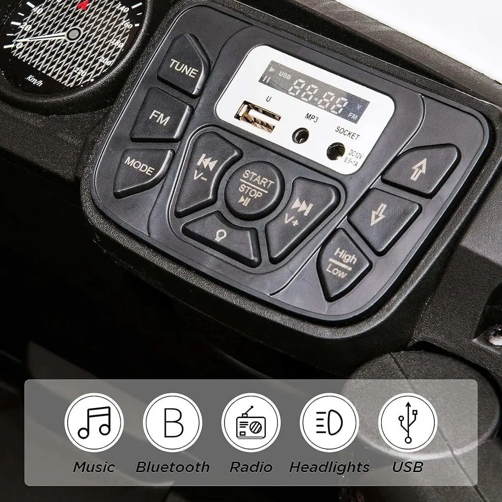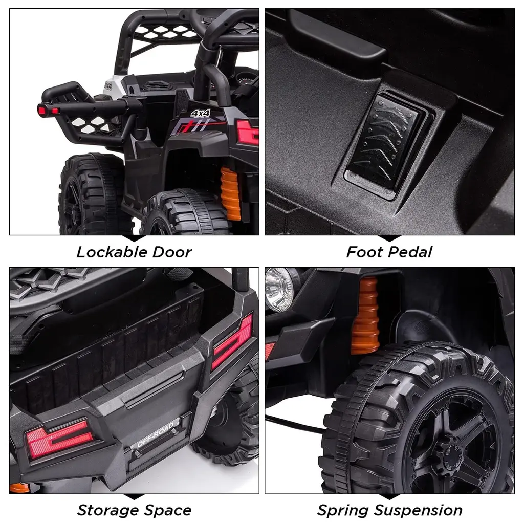 Safety Guarantee--This kids ride on car certified by ASTM F963 CPSIA CPC, with slow start function,parent remote control priority, adjustable seat belt , lockable doors,spring suspension wheels, all these can make sure to prevent your child from falling off or other danger. Manual & Parental Control-- The parent can control the tractor to enjoy the happiness time with child. The child also can operate by themself by foot pedal to control ideal speeds. There are 2 speeds for manual, 3 speed from 1.8-3.7 mph to operate by remote control. Rechargeable Battery--This electric vehicle is equipped with 12V 4.5AH battery, charge time:8-12hrs. Overall Dimensions:39.17"L x 25.98"W x 27.95"H, suitable for 37-96 months children, max weight capacity is 66 lbs. Build-in Fun--The ride on vehicle equipped with MP3, USB port, AUX input, FM radio, bright LED headlights to provide much more funny for child. The rear storage bin will allow your kids to take toys along with them. Realistic UTV Design--Bright LED headlights,control pedal, detachable trailer(Optional),realistic engine sound and horn, rechargeable battery with 2*12V motor,offer an authentic experience.