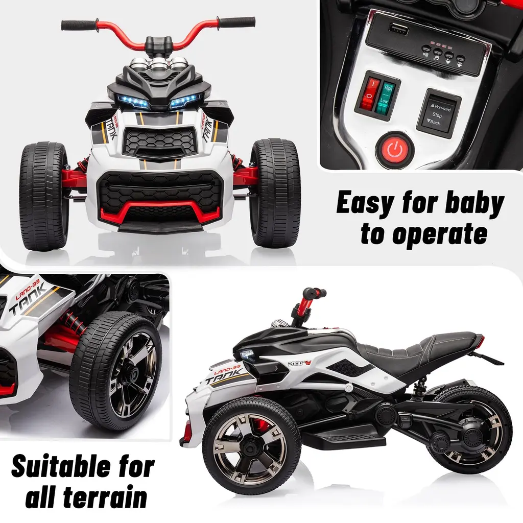 Simulation ATV Design: The Kids ATV boasts a cool and realistic appearance that immediately captures children's attention. Kids can easily operate the electric motorcycle just like grownups by pressing the accelerator pedal to go and using the steering handle to control the direction. 12V Battery Powered Ride-On ATV: Powered by a 12V rechargeable battery, this ride-on ATV provides a speed range of 1.9 to 4.3 mph. With three wear-resistant wheels featuring spring suspension, it ensures a smooth driving experience on various terrains, including grass, brick roads, and asphalt. The ATV dimensions are 44.9 inches by 29.13 inches by 23.62 inches, with a load capacity of up to 66 lbs. Multiple Functions for Fun: To enhance playtime, this kids' electric ATV is equipped with built-in music, an MP3 player, a USB port, and Bluetooth functionality. This allows children to enjoy their favorite songs while driving, making their experience even more enjoyable. Authentic Driving Experience: The ATV features wear-resistant EVA tires and a shock absorber system, providing safe and smooth driving in various conditions. Advanced slow-start technology helps protect children from the abrupt acceleration that could be intimidating, while a wide seat ensures comfort during rides. All-Terrain, All-Day Endless Play: With a 12V 7AH rechargeable battery, the ATV can run for 1-2 hours after a charging time of 8-12 hours. Its high-performance, wear-resistant tread tires are designed for a smooth ride on multiple surfaces, from beaches to rubber tracks and cement roads. Additionally, the cool LED headlights illuminate the path ahead, allowing for safe nighttime adventures.