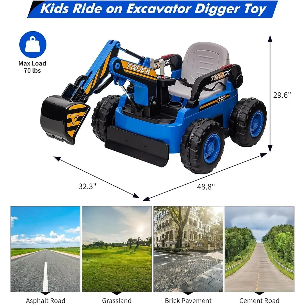 Powerful Four Motors:Equipped with four 75-watt motors, this kids' ride-on excavator accelerates to speeds between 0.93 and 3.11 mph, making it perfect for exciting adventures. Ideal as a birthday gift for boys and girls aged 3-8. Long-Lasting Playtime:The ride-on toy features a 12V 10AH battery that fully charges in 8-12 hours, providing up to 50 minutes of continuous play. This is perfect for outdoor adventures without the hassle of constant recharging. Two Driving Modes:Enjoy a realistic driving experience with pedals and joysticks for authentic control. The included remote allows for parental supervision, ensuring a safe and interactive playtime for kids. All-Terrain Capability:Built with wear-resistant, non-slip tires, this construction vehicle easily navigates various surfaces, including sand, grass, bricks, and concrete. This ensures versatile outdoor enjoyment for young adventurers. Fun & Functional:This battery-powered excavator offers multimedia features, including MP3 music playback and a USB port, along with bright rear lights. These elements create an engaging multi-sensory play environment for little ones weighing up to 66 lbs.