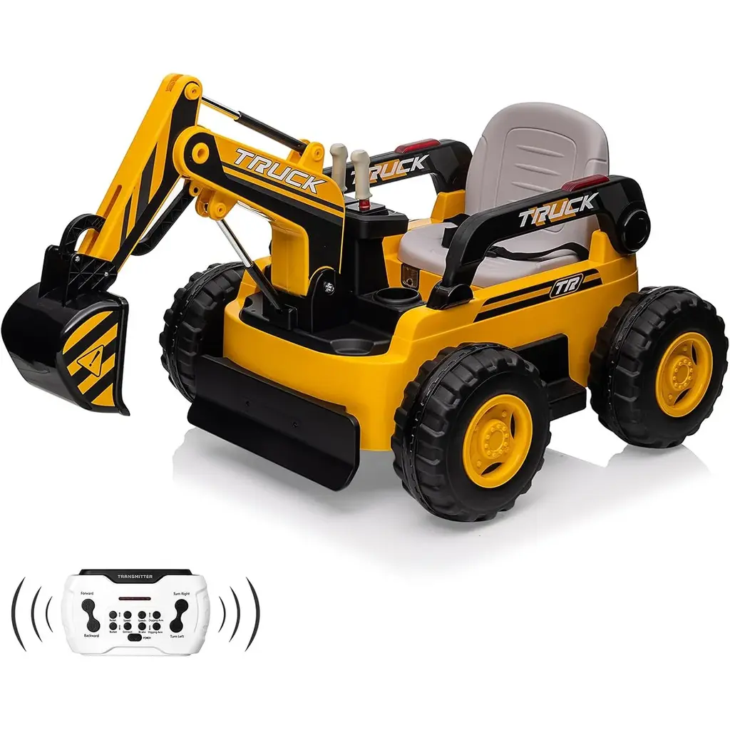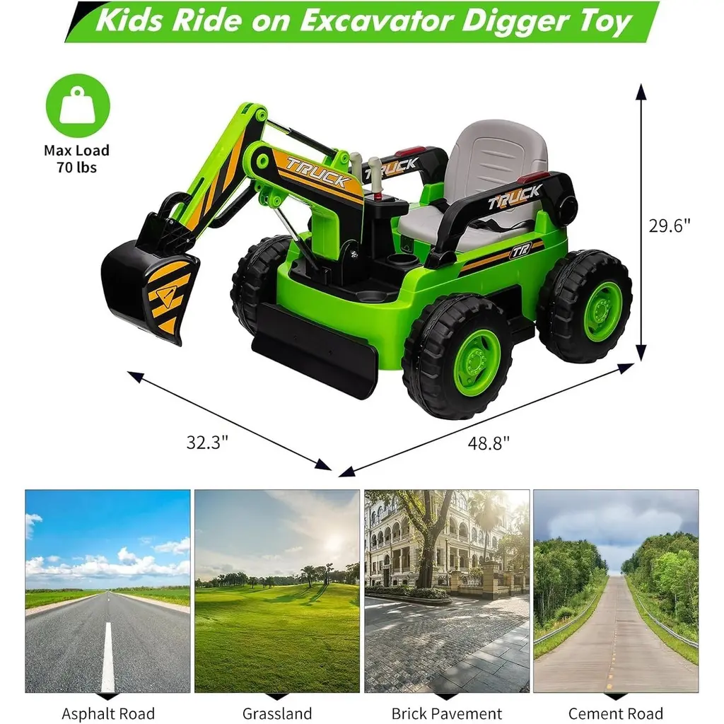 Powerful Four Motors:Equipped with four 75-watt motors, this kids' ride-on excavator accelerates to speeds between 0.93 and 3.11 mph, making it perfect for exciting adventures. Ideal as a birthday gift for boys and girls aged 3-8. Long-Lasting Playtime:The ride-on toy features a 12V 10AH battery that fully charges in 8-12 hours, providing up to 50 minutes of continuous play. This is perfect for outdoor adventures without the hassle of constant recharging. Two Driving Modes:Enjoy a realistic driving experience with pedals and joysticks for authentic control. The included remote allows for parental supervision, ensuring a safe and interactive playtime for kids. All-Terrain Capability:Built with wear-resistant, non-slip tires, this construction vehicle easily navigates various surfaces, including sand, grass, bricks, and concrete. This ensures versatile outdoor enjoyment for young adventurers. Fun & Functional:This battery-powered excavator offers multimedia features, including MP3 music playback and a USB port, along with bright rear lights. These elements create an engaging multi-sensory play environment for little ones weighing up to 66 lbs.